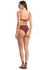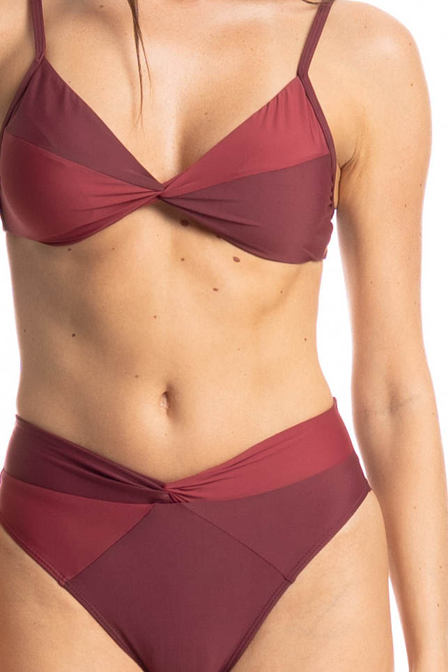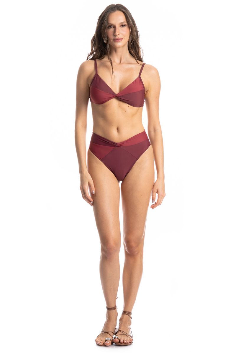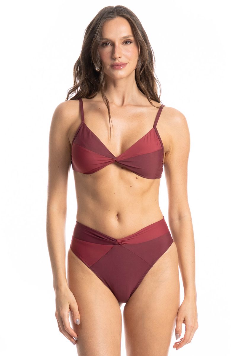 O Biquíni Bicolor com Nó Malbec combina estilo e conforto em uma peça moderna e sofisticada. O top com nó frontal valoriza o busto e possui bojo removível, permitindo ajuste perfeito ao corpo. A calcinha bicolor de cintura alta garante ótimo caimento e segurança, com fio duplo que oferece mais conforto. Ideal para quem busca um visual elegante e atual na praia ou na piscina.
