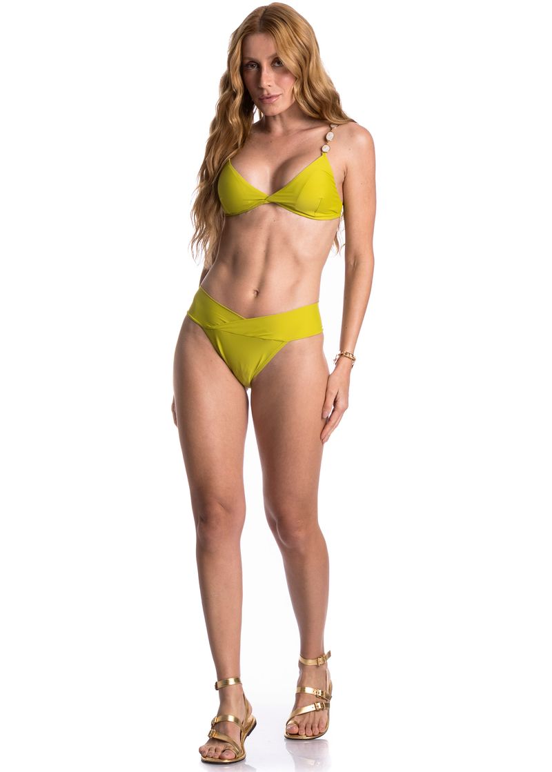 Biquíni Triângulo Transpassada Média Limoeiro é perfeito os dias de sol! Em uma modelagem que valoriza o corpo, priorizando sempre pelo seu bem-estar. Seu Top, em modelagem triângulo conta com acabamentos em elásticos que garantem excelente sustentação. As alças são paralelas e fixas com regulador que oferece o ajuste necessário para maior conforto, o fechamento é em amarre nas costas, e seu bojo removível. Detalhe para suas ponteiras nas alças que proporcionam muito charme e exclusividade. Já sua Calcinha, oferece uma boa cobertura, sua modelagem conta com o cós transpassado na frente e as laterais levemente drapeadas, trazendo toda delicadeza a peça, além de oferecer o conforto necessário para poder aproveitar e curtir o melhor do verão sem preocupações.