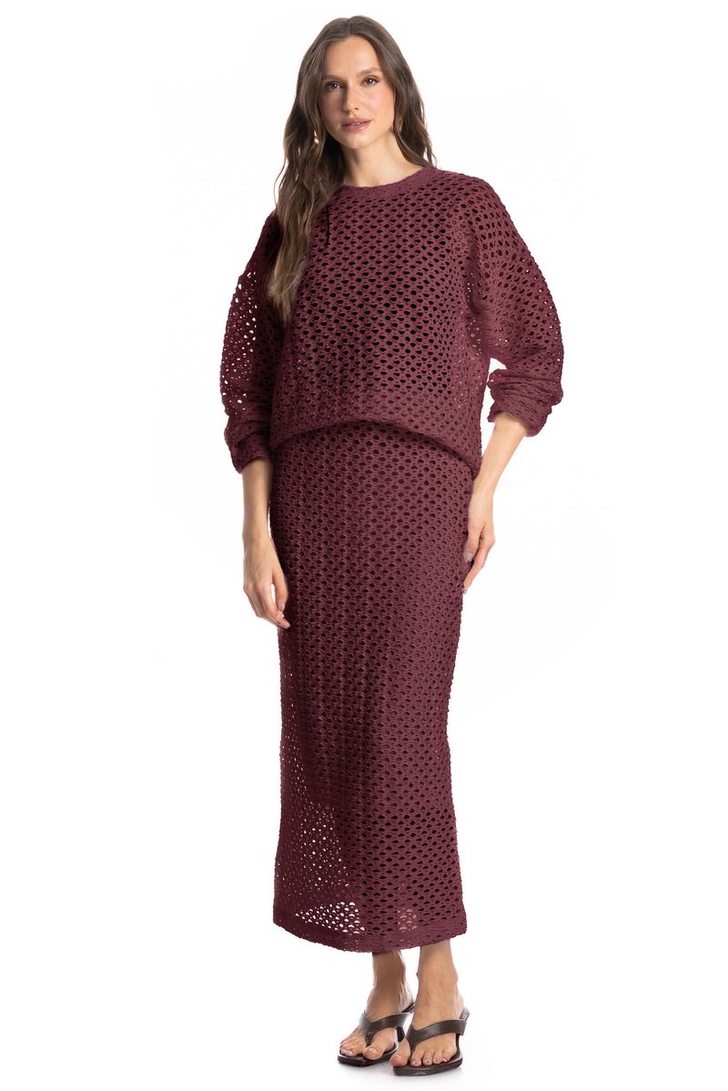 Confeccionada em Rendão, tecido vazado que confere uma aparência natural e única ao produto. Agradável ao toque e com caimento suave. Perfeito para peças de sobreposição e com leve transparência.