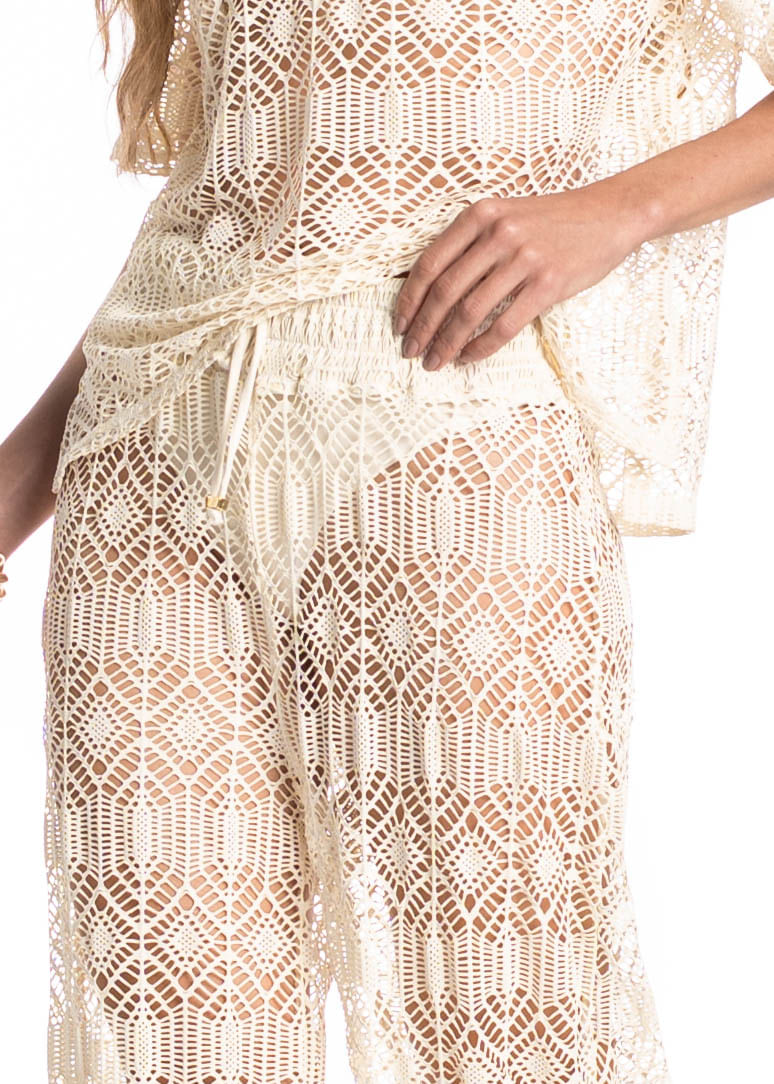 Confeccionada em Rendão, tecido vazado que confere uma aparência natural e única ao produto. Agradável ao toque e com caimento suave. Perfeito para peças de sobreposição e com leve transparência.