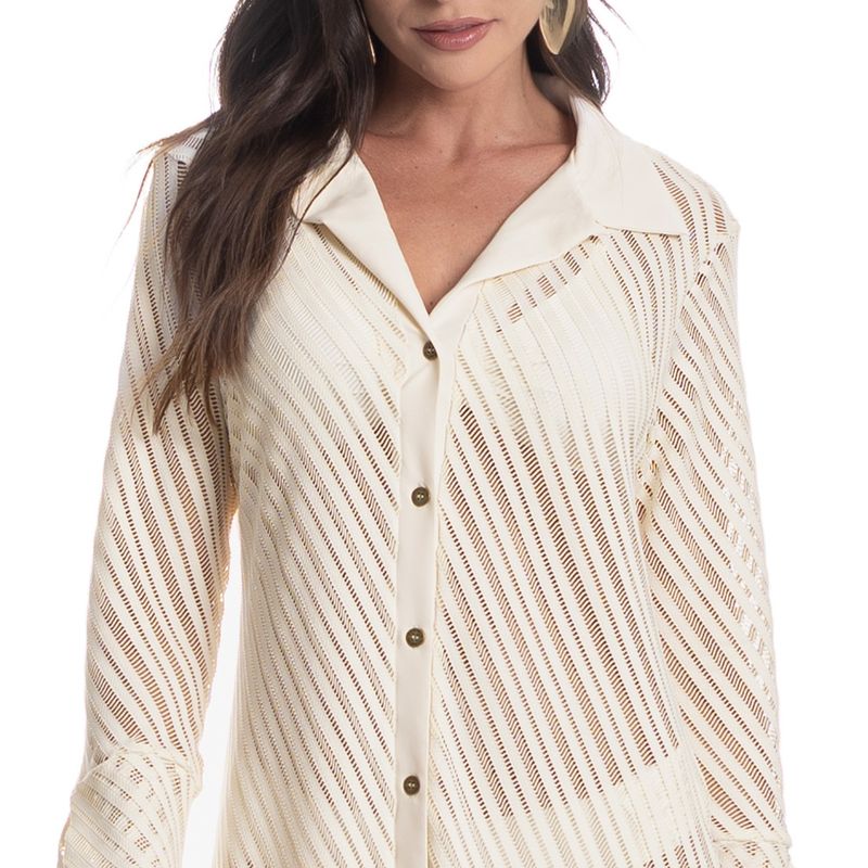 Camisa Feminina Em Rendão Safari é perfeita para seu verão! Com comprimento curto e modelagem ampla, a Camisa Safari é ideal para compor looks leves e estilosos no verão. Confeccionada em rendão, ela traz frescor e textura ao visual. Possui gola clássica, mangas 7/8 com punhos e fechamento frontal por botões bem fixados, garantindo praticidade e acabamento impecável. Uma escolha elegante e atemporal, perfeita como saída de praia ou para sobreposições cheias de charme!