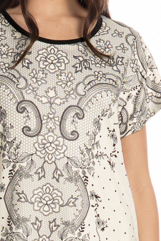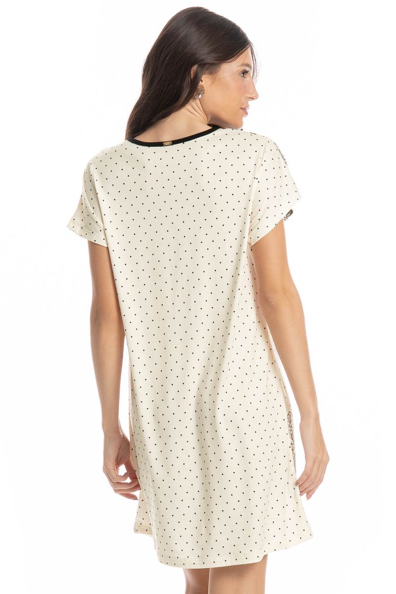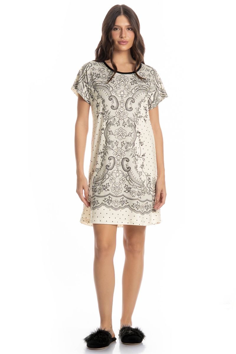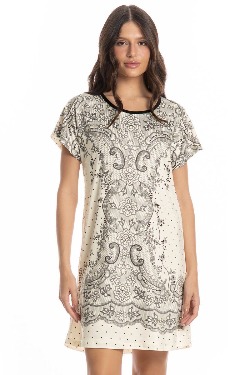 Camisão Curto Chiara é puro charme! Em modelagem ampla e confortável, seu comprimento é curto com decote redondo debruado em viés. Possui uma sofisticada e exclusiva estampa localizada, em uma perfeita combinação de cores que oferecem muita delicadeza a peça, impossível não se apaixonar!