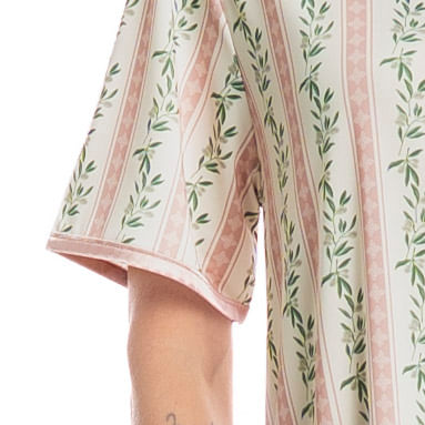Camisão Curto Oliveiras é puro charme! Em comprimento curto e modelagem ampla, o Camisão Oliveiras possui decote redondo, e manga curta com acabamento em viés de um sofisticado cetim. Detalhe para sua linda e sofisticada estampa da flor de oliveira. Estilo e elegância para seu verão!