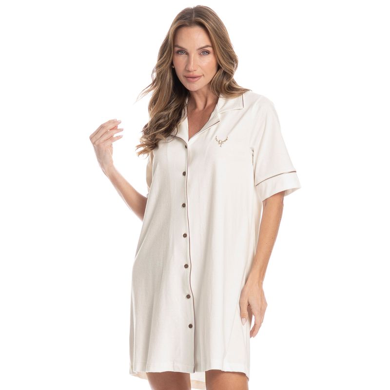 Camisão Feminino Abotoado Curto Bela é a elegância que você procurava! Camisão curto abotoado, conta com vivo aplicado em todo o transpasse, seu decote em gola e suas mangas com punho possuem vivo em tom, contrastante, além de seu bordado exclusivo Daniela Tombini na lateral esquerda. A escolha perfeita para você ficar ainda mais linda em seus momentos de descanso!