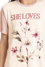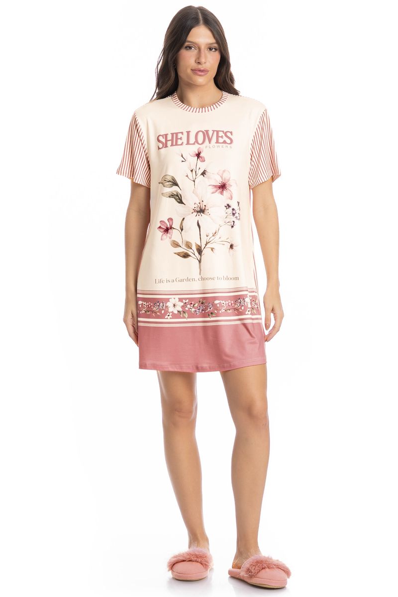Camisão Feminino Flor é puro charme! Em modelagem ampla e confortável, seu comprimento é curto com decote redondo e acabamento em viés. Possui uma exclusiva estampa localizada com escrita “She Loves Flowers”. Em uma linda combinação de cores que oferecem muita delicadeza a peça, impossível não se apaixonar!