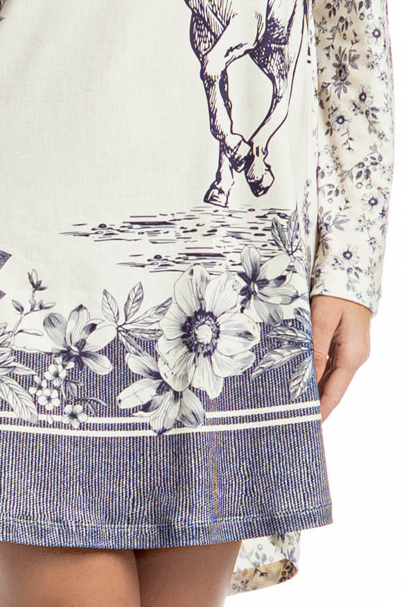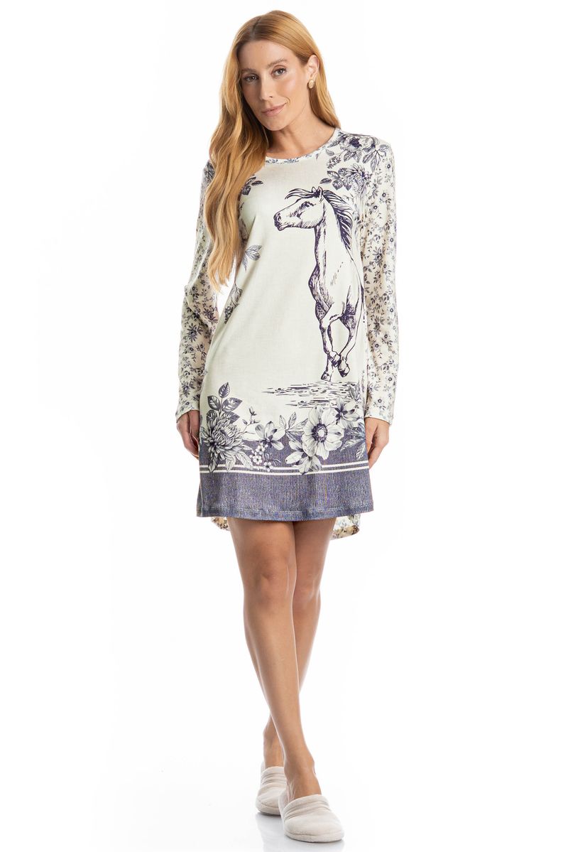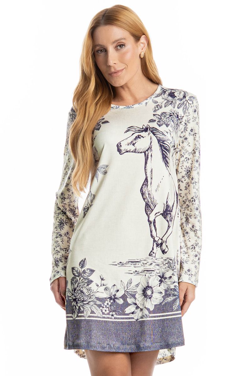 Camisão Feminino Manga Longa Amália é puro charme! Em comprimento curto e decote redondo com acabamento em viés, suas mangas são longas. Seu charme fica por conta de sua exclusiva estampa de flores e cavalo. Uma peça que garante muito conforto, leveza e suavidade para os melhores momentos!