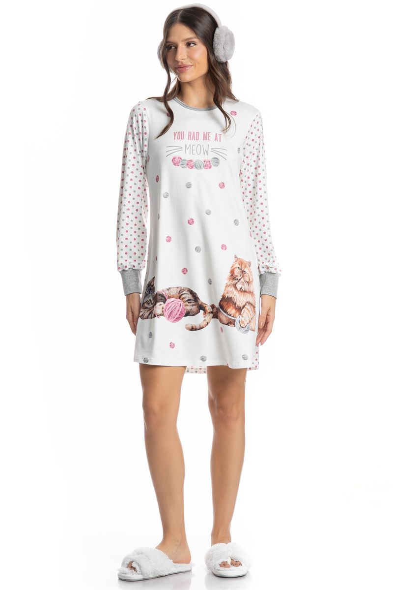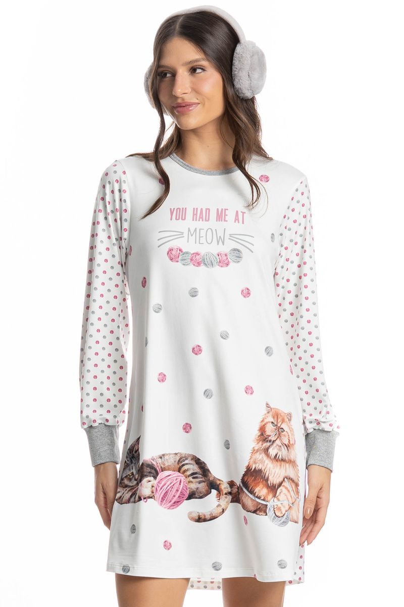 Camisão Manga Longa Cats é puro charme! Em modelagem ampla e confortável, seu comprimento é curto com manga longa e acabamento contrastante no decote e nos punhos. Detalhe para suas exclusivas e divertidas estampas de gatinhos, e com a escrita localizada ao centro “You Had Me At Meow”, impossível não se apaixonar!