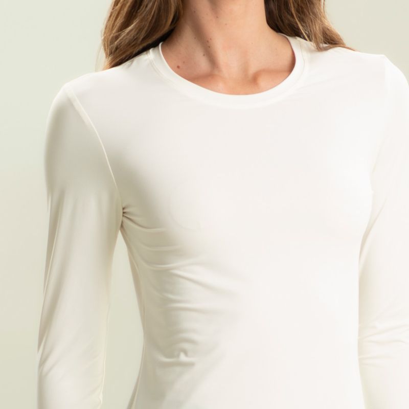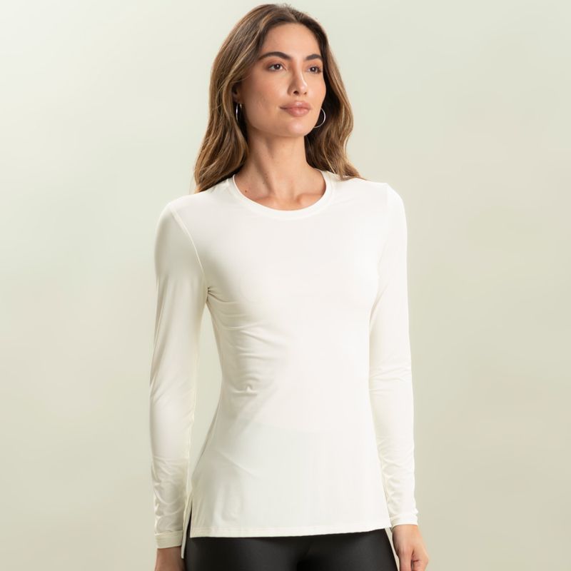 Confeccionado em Fluity-CO2, é um tecido de poliamida biodegradável 6.6, com proteção UV, que apresenta um visual liso e uma estrutura suavemente elastizada. Seus filamentos são mais finos que um fio de cabelo humano, proporcionando contato extremamente suave com a pele e excepcional conforto, aliado à eficiente absorção da umidade natural do corpo.