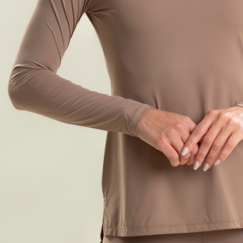 Confeccionado em Fluity-CO2, é um tecido de poliamida biodegradável 6.6, com proteção UV, que apresenta um visual liso e uma estrutura suavemente elastizada. Seus filamentos são mais finos que um fio de cabelo humano, proporcionando contato extremamente suave com a pele e excepcional conforto, aliado à eficiente absorção da umidade natural do corpo.