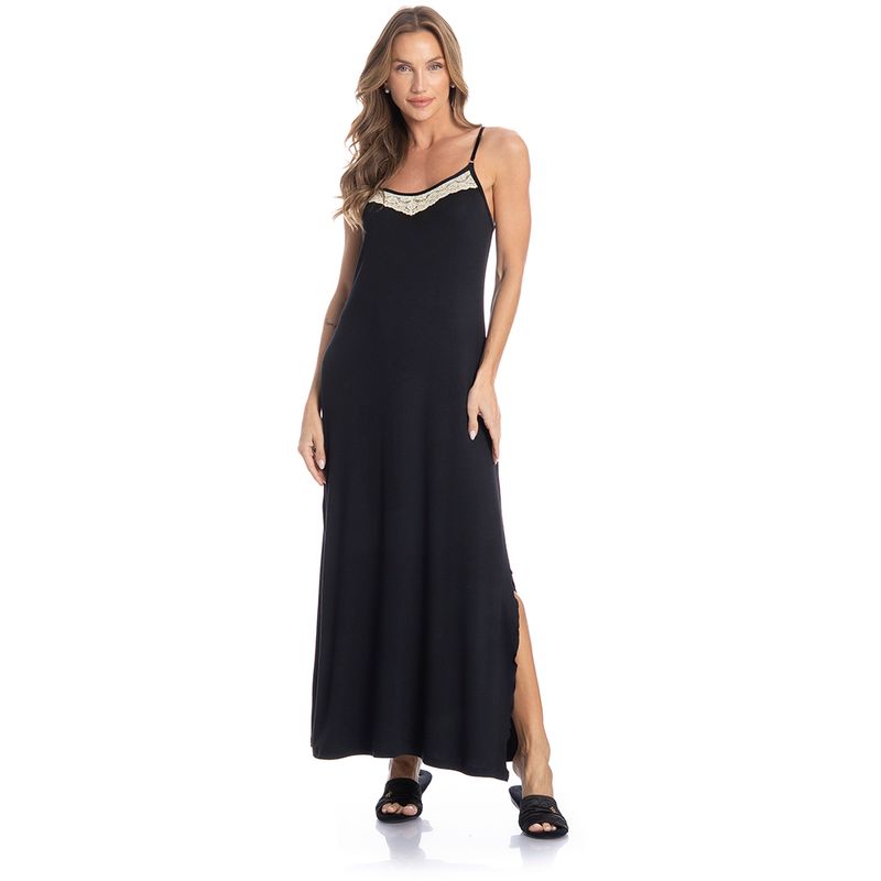 Camisola Longa Sofia é puro conforto! Em comprimento longo e modelagem ampla, a Camisola Sofia possui alças finas e reguláveis, seu decote possui aplicação de uma linda e delicada renda, e suas laterais contam com aberturas que proporcionam excelente caimento e fluidez.