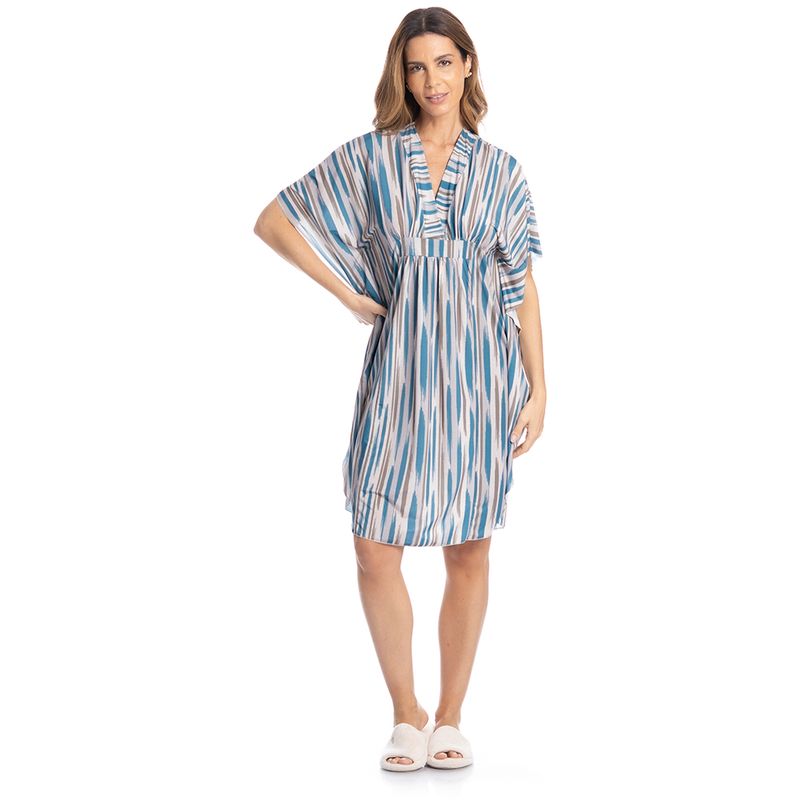 Kaftan Feminino Médio Elen é puro charme! Em modelagem ampla, confortável e em comprimento médio próximo ao joelho, conta com decote em V transpassado, e leves franzidos na cintura produzindo um lindo e fluído efeito na peça, além de valorizar o corpo. Suas mangas são alongadas e amplas. Em uma linda estampa exclusiva para te acompanhar nos melhores momentos!