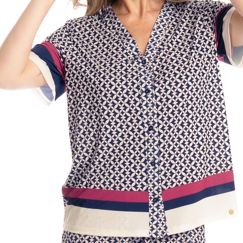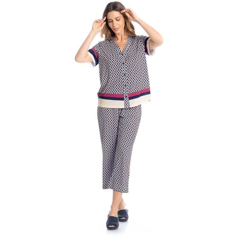 Pijama Americano Capri Catarina é puro charme! Em modelagem muito confortável, sua blusa abotoada manga curta possui um perfeito acabamento e botões bem fixados. Detalhe para sua plaquinha logo Daniela Tombini na lateral inferior esquerda da peça. Sua calça em modelagem capri possui elástico macio e confortável no cós proporcionando um melhor descanso. Perfeito para te deixar ainda mais linda nos melhores momentos!