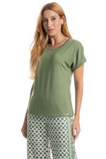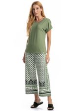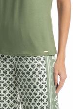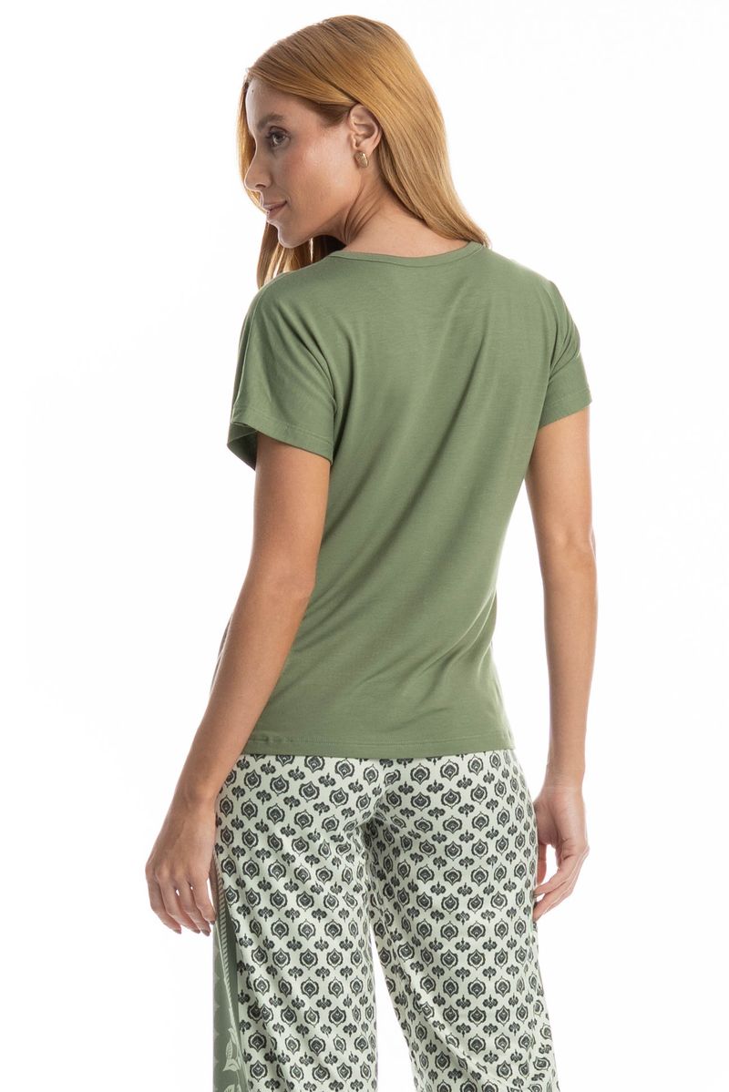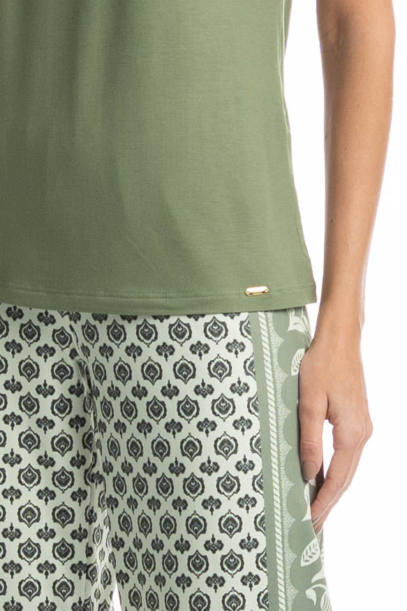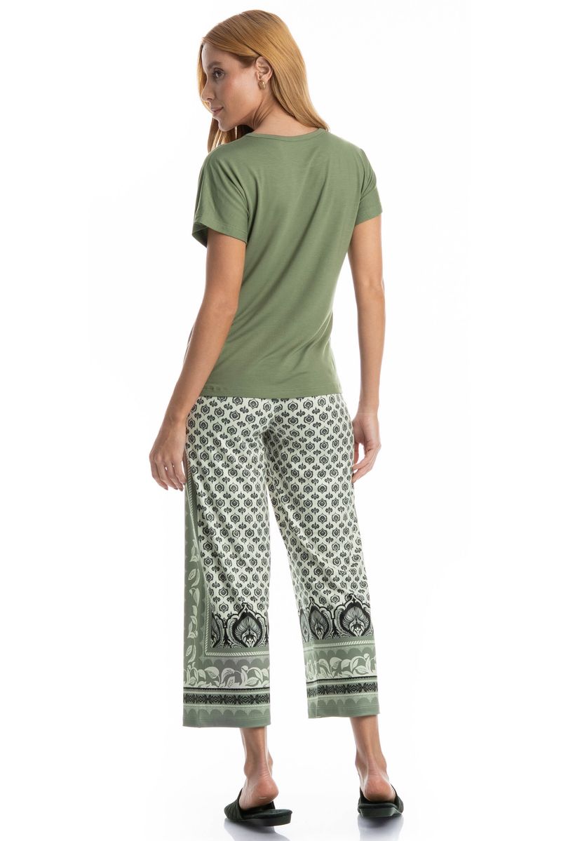 Pijama Feminino Capri Constanza é estilo para suas horas de descanso! Sua blusa lisa possui modelagem ampla e confortável, com mangas curtas e decote redondo debruado em viés. Sua calça conta com uma linda estampa, possui comprimento capri, e elástico macio no cós, muito conforto para suas noites de sono!