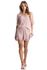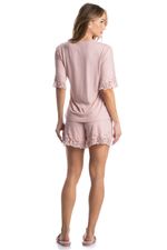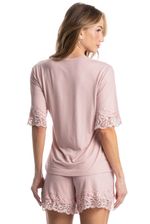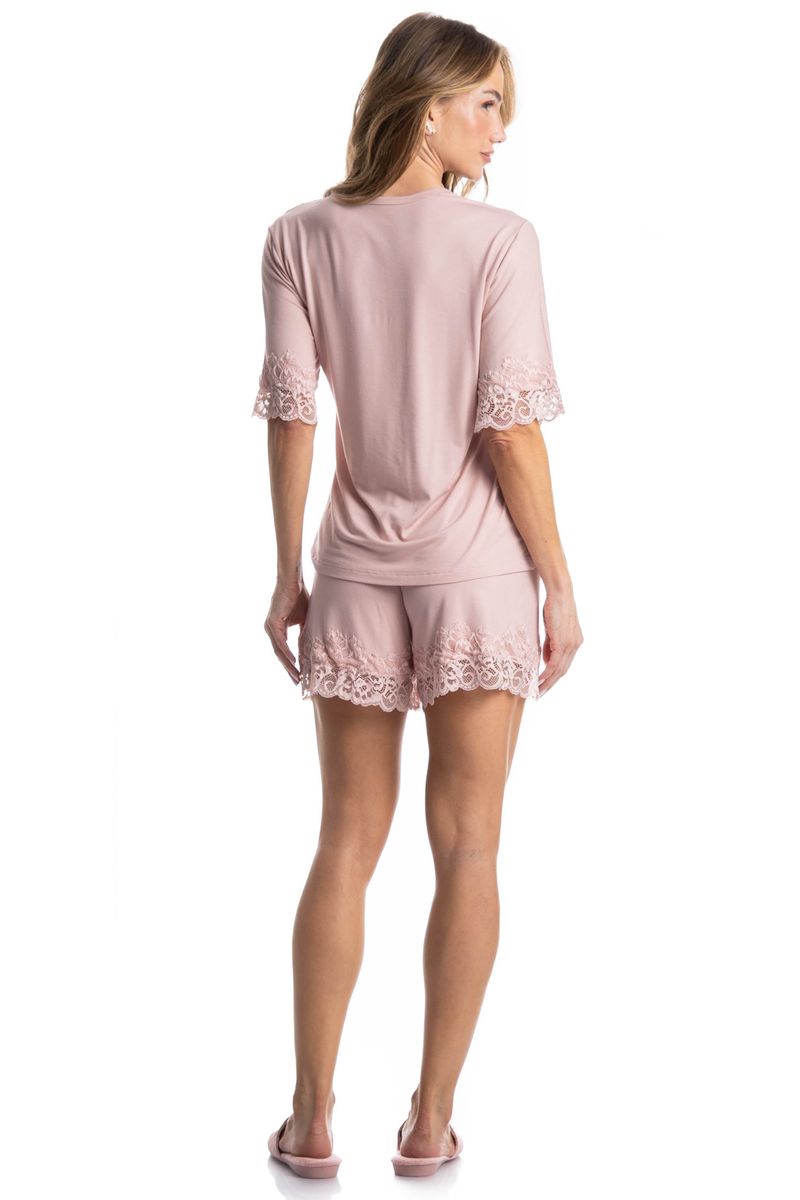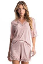 Pijama Curto Aurora é perfeito para as noites mais quentes! Sua blusa em modelagem ampla possui manga curta, e decote em V com acabamento em uma linda e sofisticada renda. Seu shorts, possui modelagem mais solta com aplicação de renda na barra, e conta com elástico macio e confortável no cós. Detalhe para sua delicada etiqueta personalizada Daniela Tombini aplicado no cós da peça proporcionando ainda mais charme!