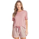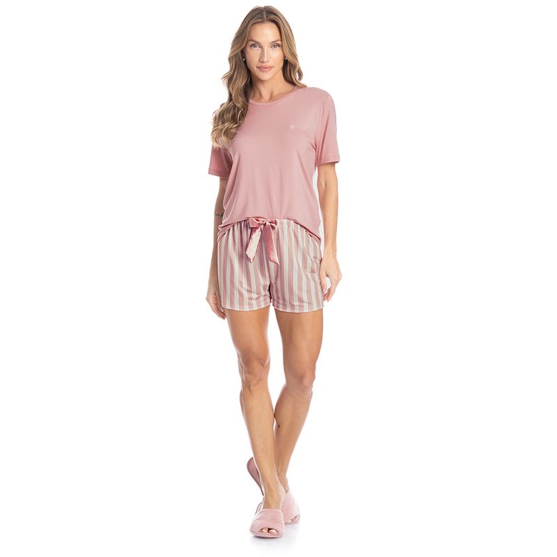 Pijama Curto Carmela é puro conforto! Sua blusinha em modelagem ampla, conta com mangas curtas e como detalhe um delicado bordado logo Daniela Tombini na lateral esquerda da peça. Seu shorts é soltinho e leve, possui elástico macio no cós e uma moderna e exclusiva estampa de listras. Detalhe para seu laço de cetim aplicado no centro do cós, garantindo ainda mais charme!