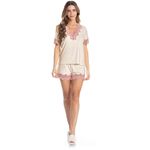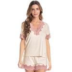 Pijama Curto Com Renda Laura é pura delicadeza! Sua blusa em modelagem ampla possui mangas curtas e decote em V com aplicação de uma linda e delicada renda em tom contrastante. Detalhe para seu bordado logo Daniela Tombini na lateral inferior esquerda da peça. Seu short possui aplicação de renda na barra, e conta com elástico macio e confortável no cós. A escolha perfeita para te deixar ainda mais linda na melhor estação do ano!