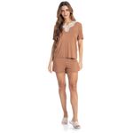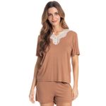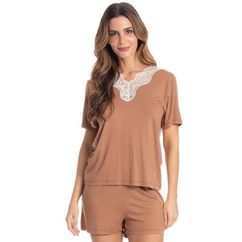 Pijama Curto Com Renda Marisa é puro conforto para suas noites de verão! Sua blusa em modelagem ampla, conta com mangas curtas e aplicação de uma linda e sofisticada renda no decote. Detalhe para seu bordado logo Daniela Tombini na lateral inferior esquerda da peça, garantindo ainda mais charme! Seu shorts em modelagem ampla e leve, possui elástico macio no cós proporcionando muito conforto em seus momentos de descanso. Uma peça que garante muita leveza e suavidade para os melhores momentos, disponível em três opções de cores!
