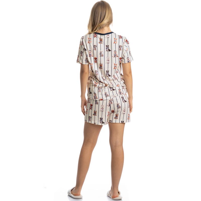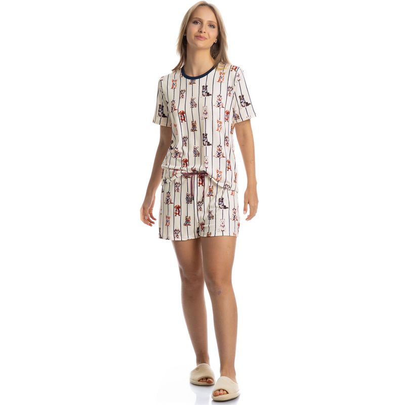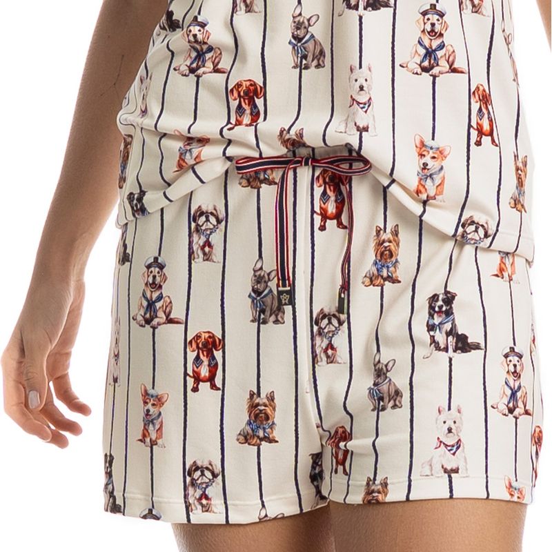 Pijama Curto Feminino Sailor Dogs é puro charme! Sua blusa manga curta possui modelagem ampla e decote redondo debruado em viés de tom contrastante. Seu shorts também em modelagem leve, possui falso amarre e elástico macio no cós, garantindo muito conforto em seus momentos de descanso. Detalhe para sua exclusiva e divertida estampa de cães marinheiros, impossível não se apaixonar!