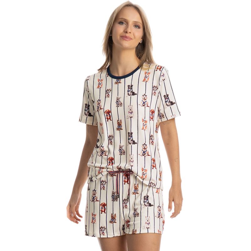 Pijama Curto Feminino Sailor Dogs é puro charme! Sua blusa manga curta possui modelagem ampla e decote redondo debruado em viés de tom contrastante. Seu shorts também em modelagem leve, possui falso amarre e elástico macio no cós, garantindo muito conforto em seus momentos de descanso. Detalhe para sua exclusiva e divertida estampa de cães marinheiros, impossível não se apaixonar!
