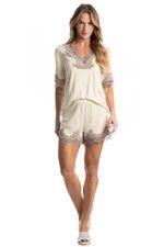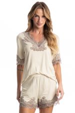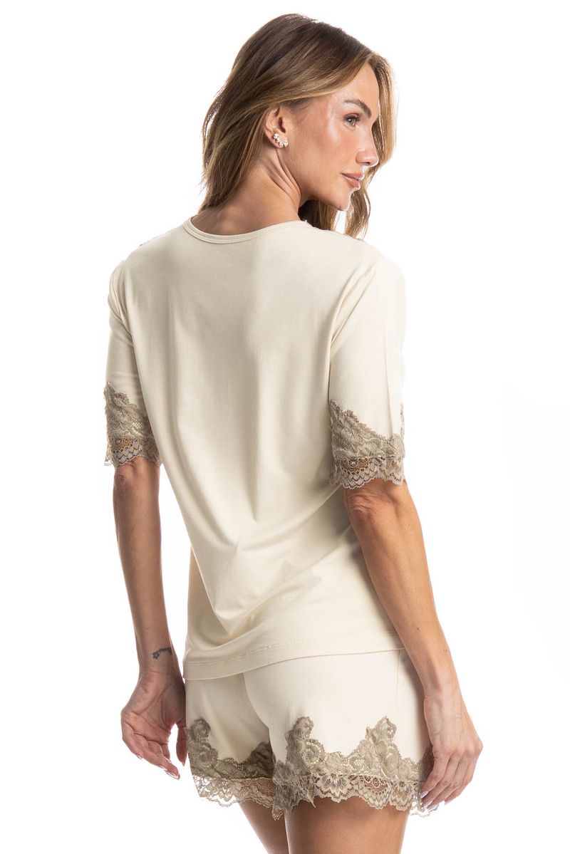 Pijama Curto Milena é perfeito para as noites mais quentes! Sua blusa em modelagem ampla possui manga curta, e decote em V com acabamento em uma linda e sofisticada renda. Seu shorts, possui modelagem mais solta com aplicação de renda na barra, e conta com elástico macio e confortável no cós. Detalhe para sua delicada etiqueta personalizada Daniela Tombini aplicado no cós da peça proporcionando ainda mais charme!