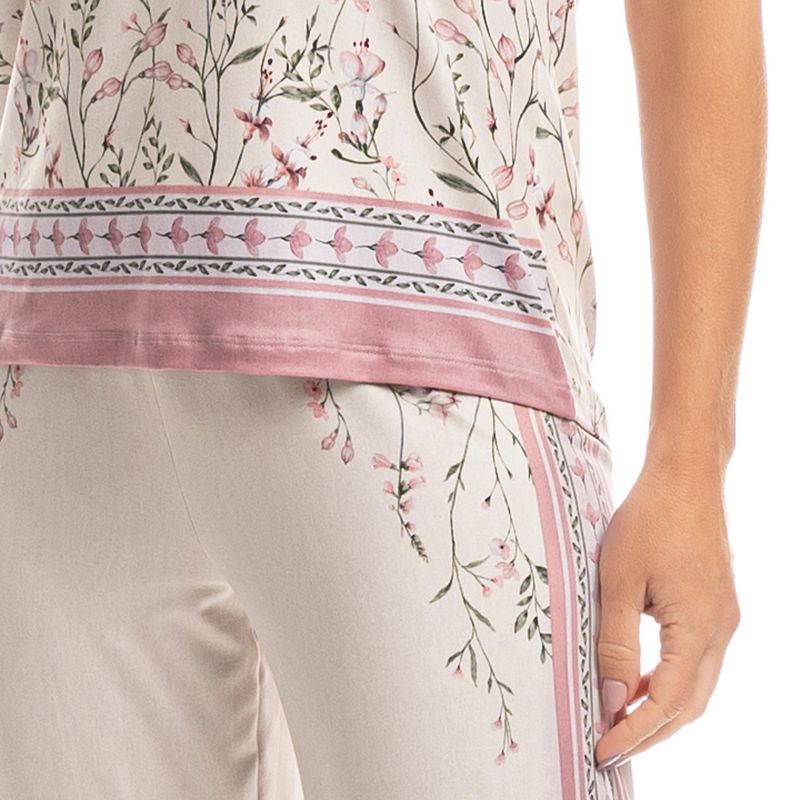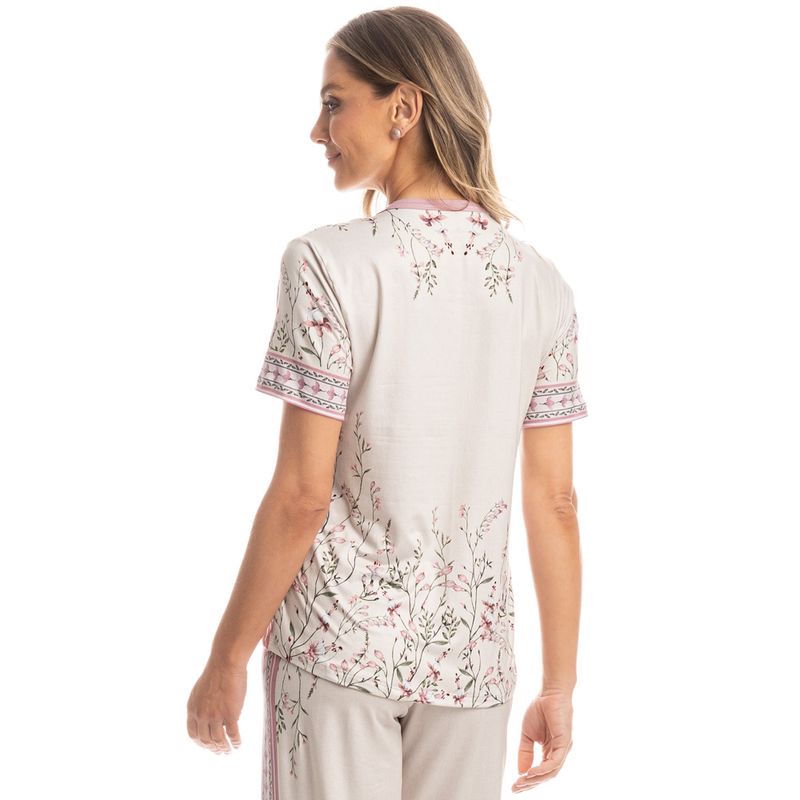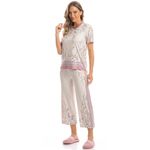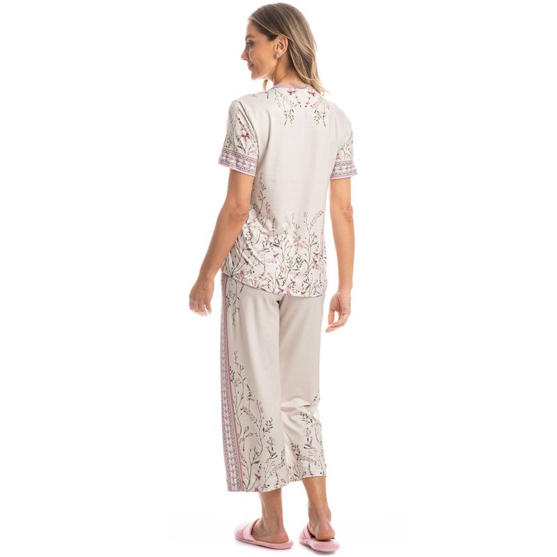 Pijama Feminino Capri Brinco De Princesa é elegância para suas noites! Sua blusa em modelagem ampla, conta com mangas curtas e decote redondo com acabamento em viés. Sua calça em modelagem capri, possui cós com elástico macio e confortável. Detalhe para sua linda e exclusiva estampa localizada floral de brinco de princesa desenhada à mão. A escolha perfeita para você desfrutar o melhor da estação!