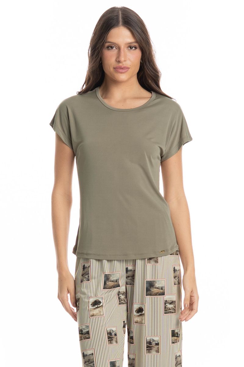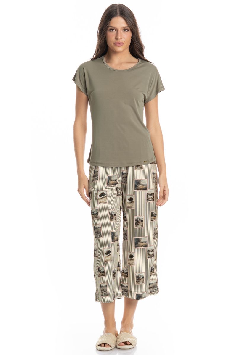 Pijama Feminino Capri Campo é conforto para suas noites! Em modelagem ampla e confortável, sua blusa lisa possui manga curta e decote redondo com acabamentos em viés. Já a sua calça em modelagem capri é toda estampada, e possui elástico macio no cós que garante muito conforto. Muito estilo, leveza e suavidade nos melhores momentos!