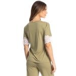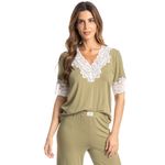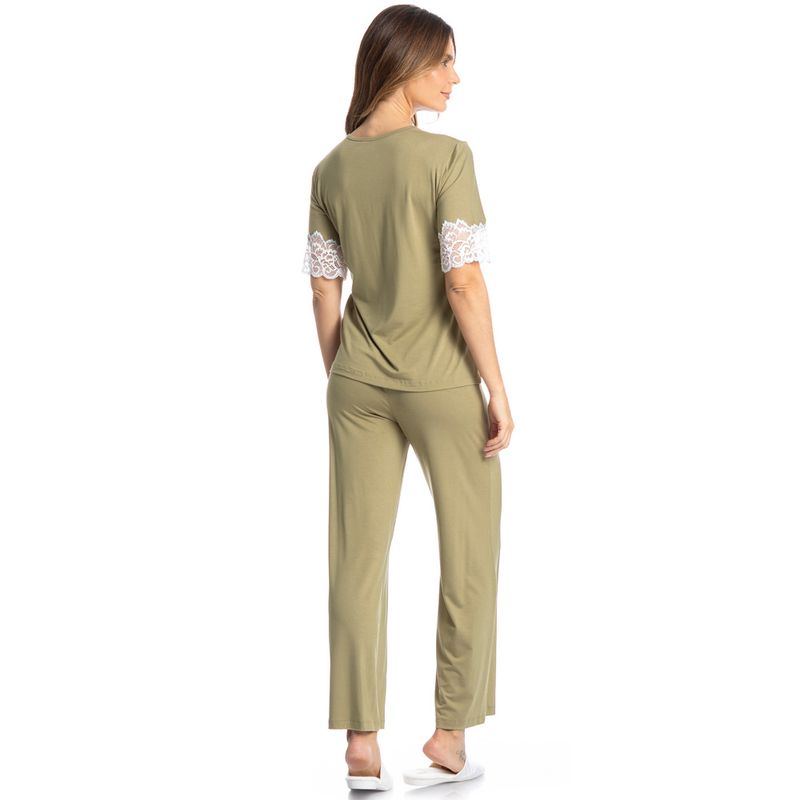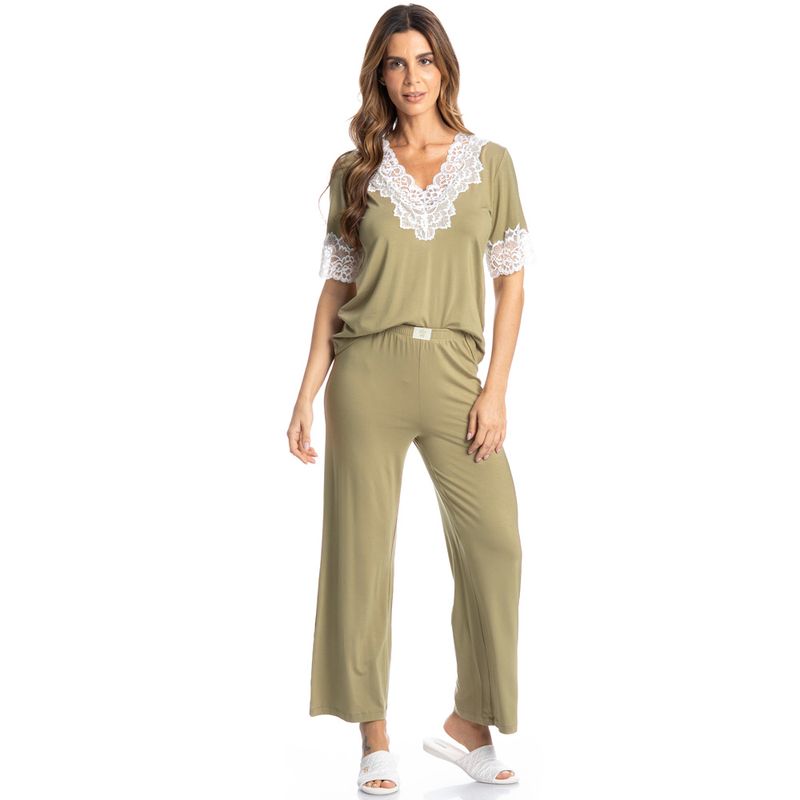 Pijama Feminino Capri Com Renda Aurora é elegância para suas noites! Sua blusa em modelagem ampla possui manga curta, e decote em V com acabamento em uma linda e sofisticada renda. Sua calça em modelagem capri possui cós com elástico macio e uma delicada etiqueta personalizada Daniela Tombini aplicad, garantindo ainda mais charme!