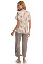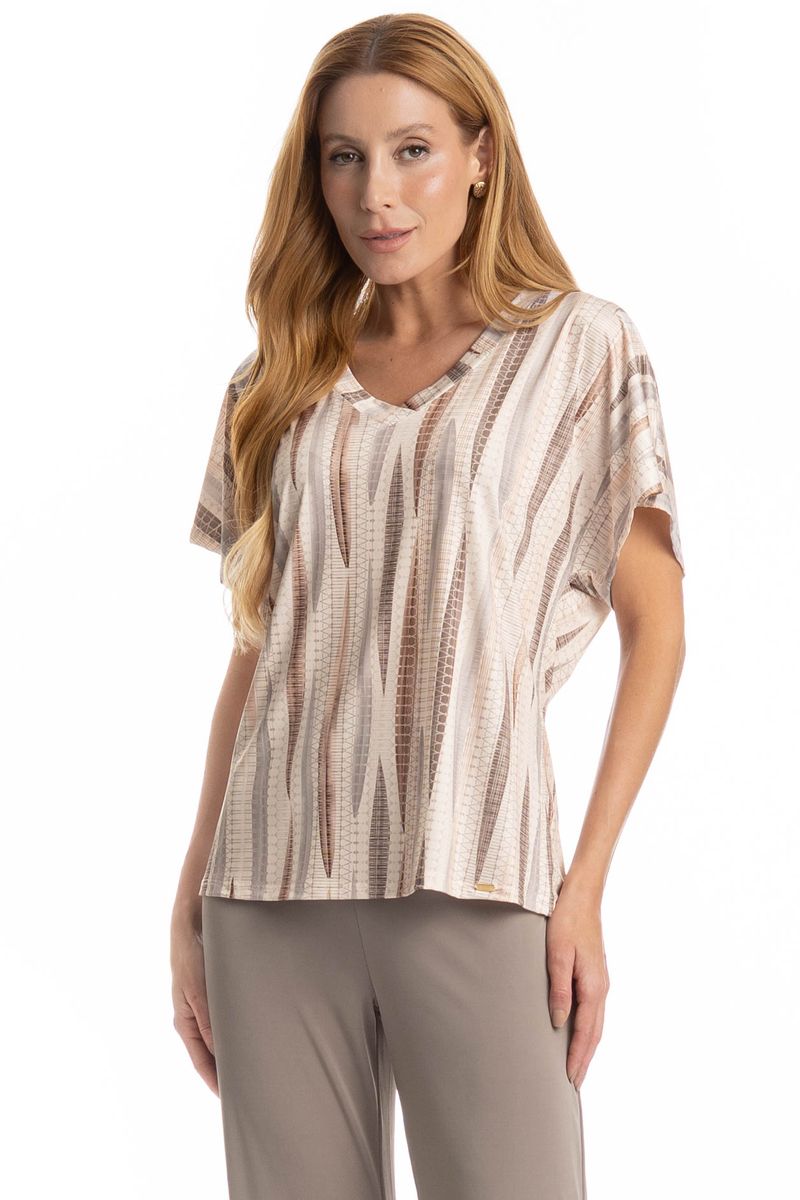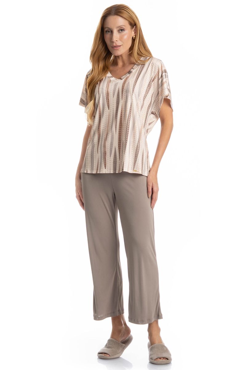 Pijama Feminino Capri Gisele é conforto para suas noites! Em modelagem ampla e confortável, sua blusa possui manga curta e decote em V com acabamento em gola. Detalhe para a plaquinha logo Daniela Tombini na lateral inferior esquerda da peça. Já a sua calça em modelagem capri, possui elástico macio no cós que garante muito conforto. Muito estilo, leveza e suavidade nos melhores momentos!