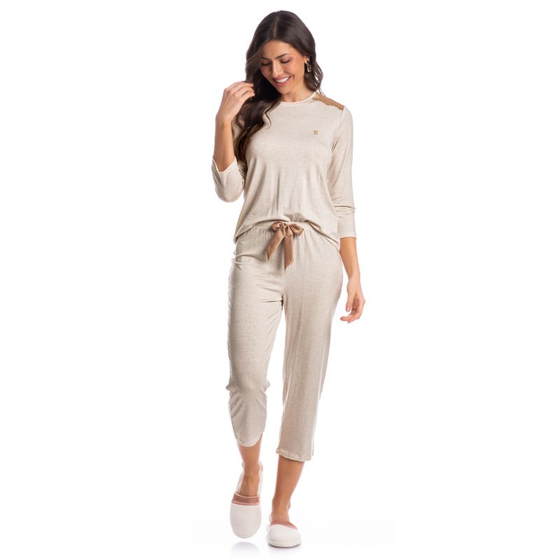 Pijama Feminino Capri Ivone é elegância para os melhores momentos! Sua blusa possui modelagem ampla e confortável, com mangas longas, decote redondo debruado em viés e bordado contratante logo flor Daniela Tombini na lateral esquerda. Detalhe para a linda renda aplicada no ombro. Sua calça possui comprimento capri com elástico macio garantindo muito conforto e um delicado laço de cetim aplicado no cós da peça proporcionando ainda mais charme. A escolha perfeita para você aproveitar suas noites com muito estilo!