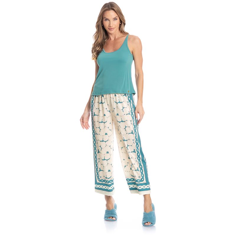 Pijama Feminino Capri Natália é puro conforto! Sua blusa lisa em modelagem ampla, conta com alças finas e decote redondo debruado em viés. Detalhe para sua plaquinha logo Daniela Tombini na lateral esquerda da peça. Já sua calça em modelagem capri leve e soltinha, conta com elástico macio no cós garantindo muito conforto em seus momentos de descanso. Detalhe para sua exclusiva estampa de conchas, proporcionando muito charme à peça!