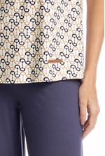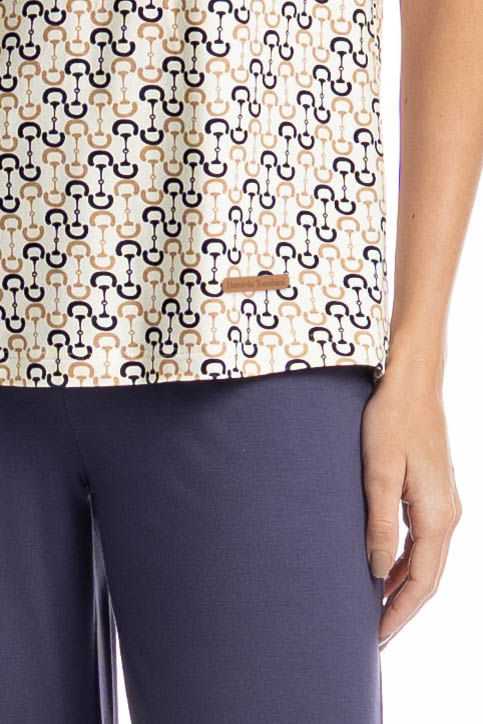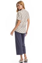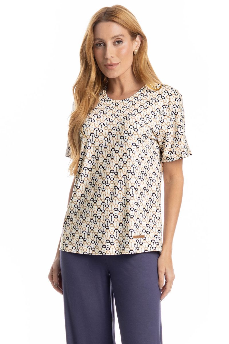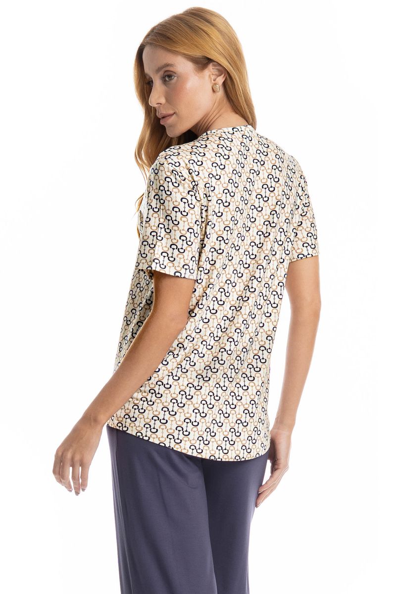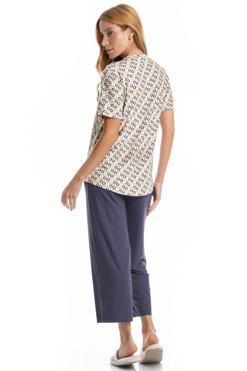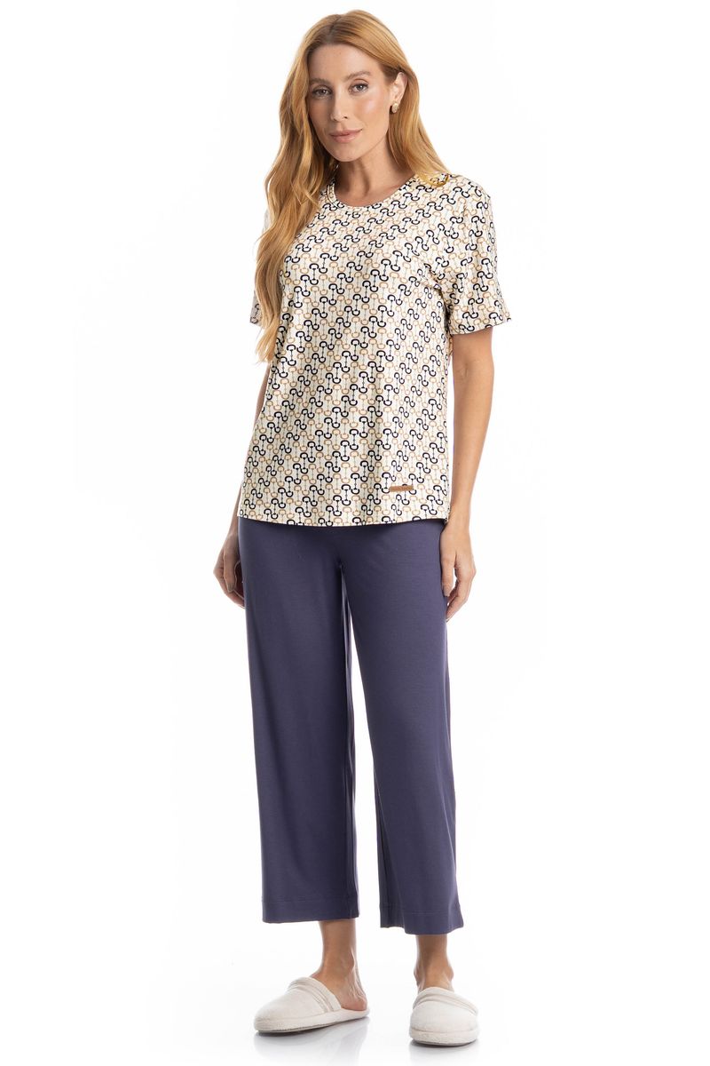 Pijama Feminino Capri Rebeca é conforto para suas noites! Em modelagem ampla e confortável, sua blusa possui manga curta e decote redondo com acabamentos em viés, possui uma linda estampa. Já a sua calça em modelagem capri conta com elástico macio no cós. Muito estilo, leveza e suavidade para seus melhores momentos!