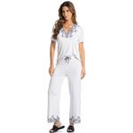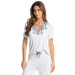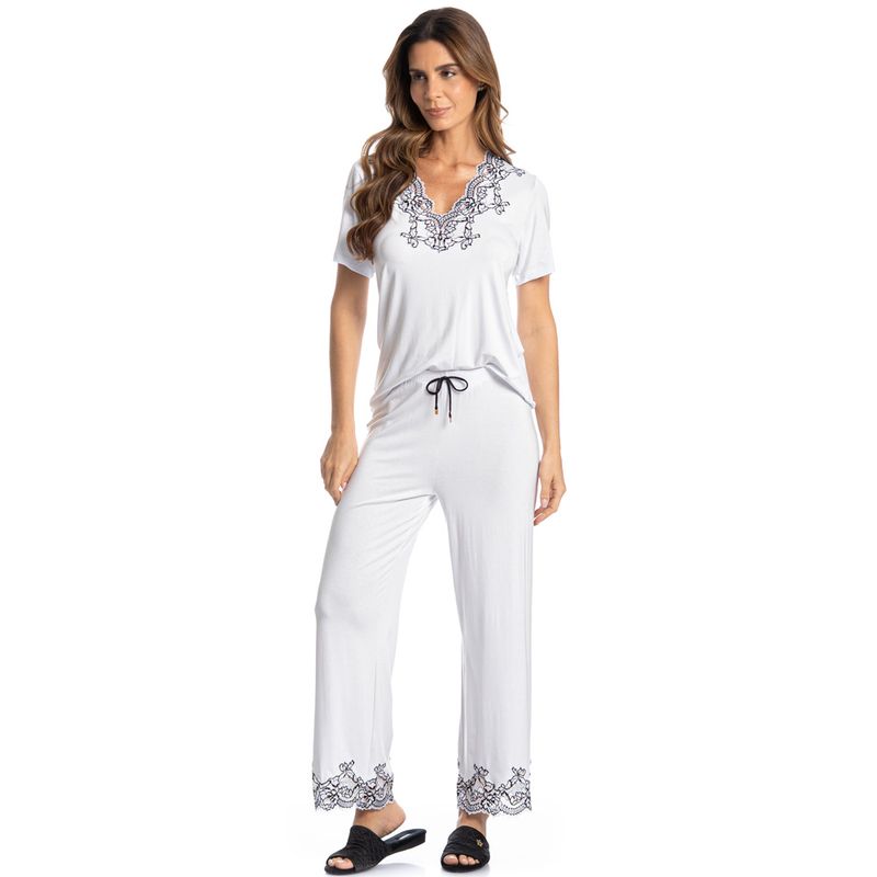 Pijama Feminino Capri Selene é puro conforto! Sua blusa em modelagem ampla e muito confortável, possui aplicação de uma linda e sofisticada renda no decote, proporcionando muito charme à peça. Sua calça em modelagem soltinha e leve com elástico macio e confortável, conta com renda na barra e detalhe de falso amarre no centro do cós. Perfeito para você aproveitar a melhor estação do ano!