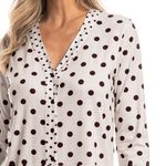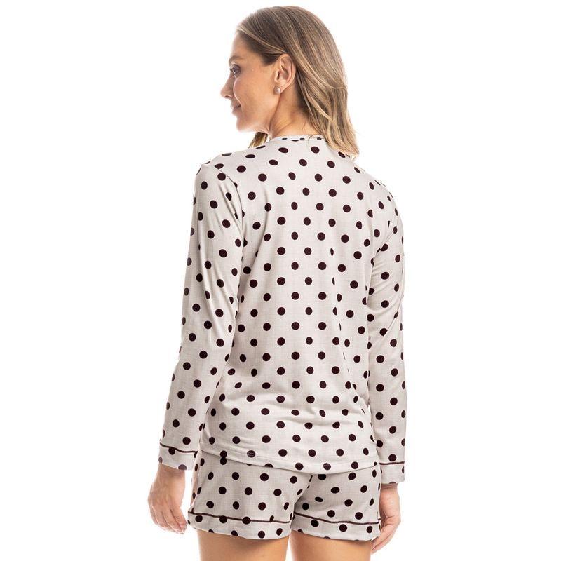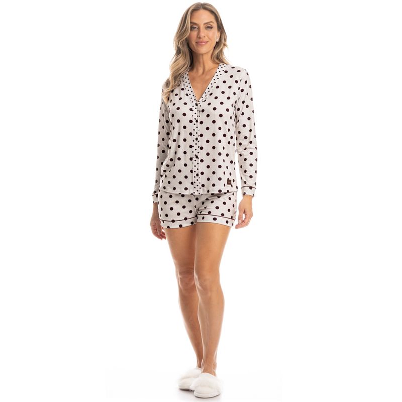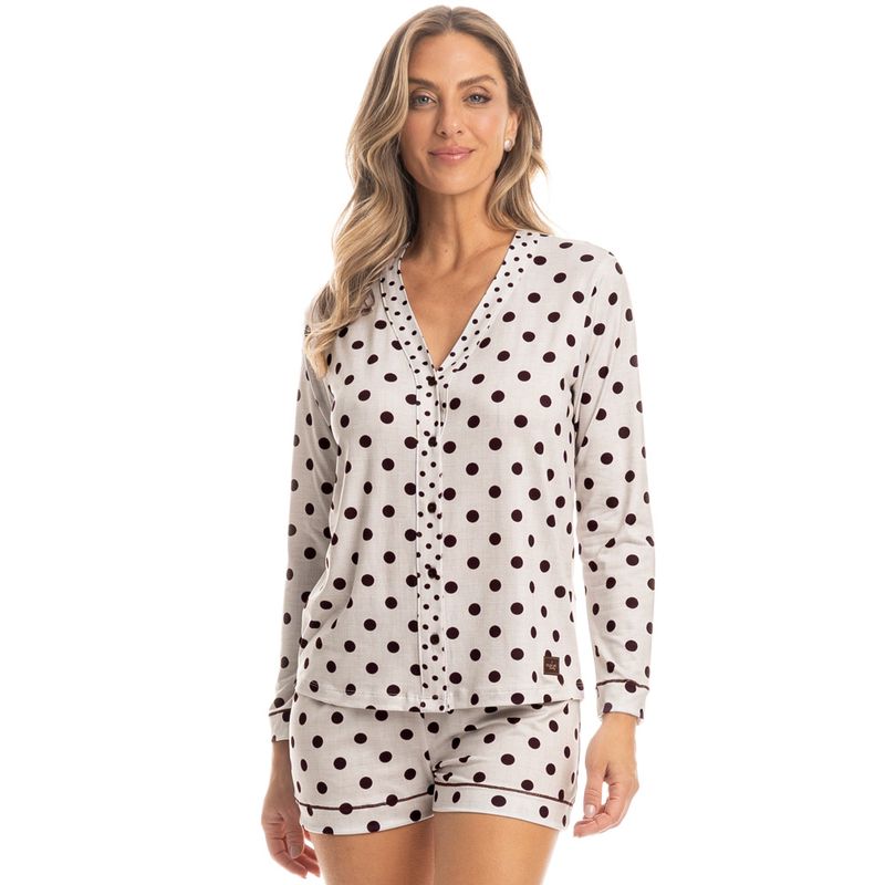 Pijama Feminino Curto Americano Carmela é estilo para suas horas de descanso! Sua blusa possui decote em V, e frente abotoada com impecável acabamento e botões bem fixados. Detalhe para suas mangas que tem como acabamento trançador, proporcionando muita delicadeza à peça. Detalhe para sua etiqueta personalizada Daniela Tombini na lateral inferior esquerda da peça. Seu short tem modelagem ampla e confortável, possui elástico macio no cós para melhor descanso, e sua barra conta com acabamento em trançador. A escolha perfeita para você aproveitar o melhor da estação!