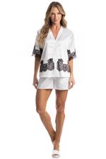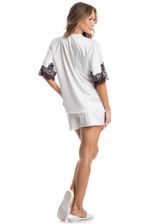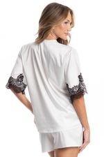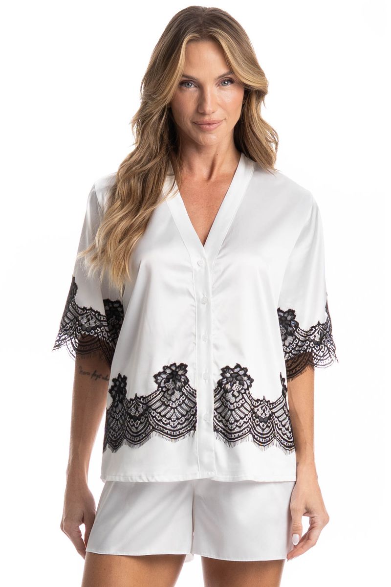 Pijama Feminino Curto Americano Chloe é pura elegância! Sua blusa possui decote em V, manga curtas e frente abotoada com um excelente acabamento e botões bem fixados. Detalhe para suas aplicações com uma linda e sofisticada renda nas mangas e frentes da blusa. Já o seu shorts, conta com modelagem soltinha, elástico macio no cós para maior conforto. Este pijama é uma excelente opção para quem busca sofisticação e elegância para todas as horas do dia!
