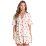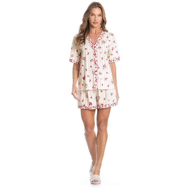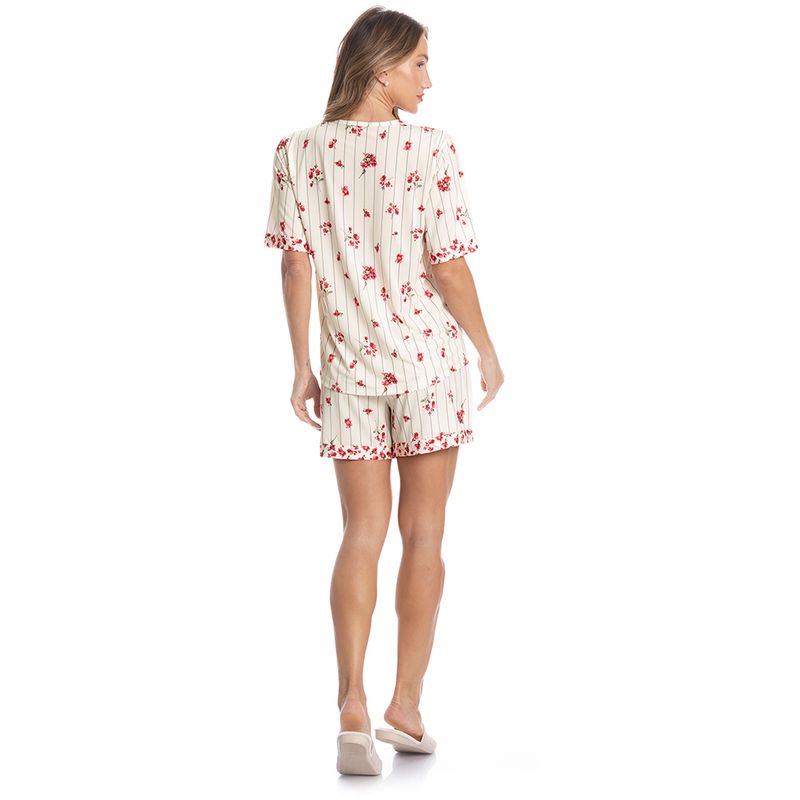 Pijama Feminino Curto Americano Primavera é estilo para suas horas de descanso! Sua blusa possui decote em V, e frente abotoada com impecável acabamento e botões bem fixados. Detalhe para suas mangas e aberturas frontais que tem como acabamento viés de estampa contrastante, proporcionando muita delicadeza à peça. Seu short em modelagem ampla e confortável, possui elástico macio no cós para melhor descanso, e sua barra conta com acabamento em viés. Detalhe para sua linda e delicada estampa floral, uma peça que garante muito conforto, leveza e suavidade para os melhores momentos!