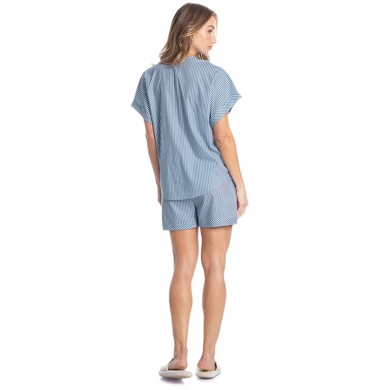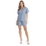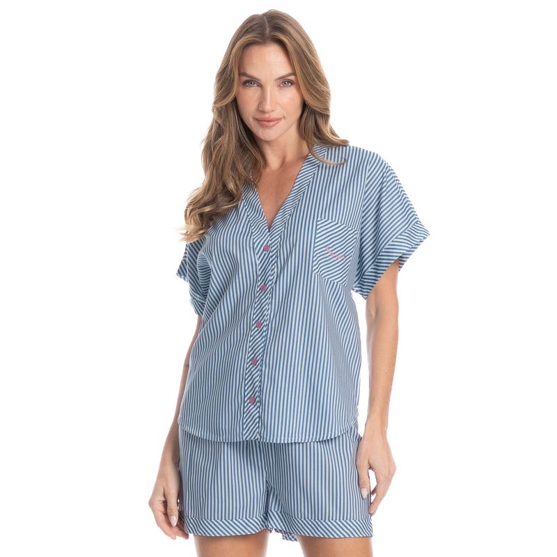 Pijama Feminino Curto Americano Vitória é perfeito para as suas noites! Sua blusa em modelagem ampla e extremamente confortável, possui manga curta e decote em “V” com acabamento em viés, e sua frente é abotoada com um excelente acabamento e botões bem fixados. Seu detalhe fica por conta de seu bolso na lateral esquerda da blusa, com delicado bordado. Já o seu shorts em modelagem soltinha e leve conta com em elástico macio para melhor conforto em suas horas de descanso. Impossível não se apaixonar!