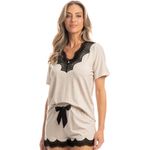 Pijama Feminino Curto Com Renda Bruna é perfeito para as noites mais quentes! Sua blusa em modelagem ampla, possui acabamento em uma linda renda e delicado pingente no decote. Seu short possui modelagem mais solta com aplicação de renda na barra, elástico macio e confortável, e um sofisticado laço de cetim cós. Muito conforto e estilo para seus momentos de descanso!