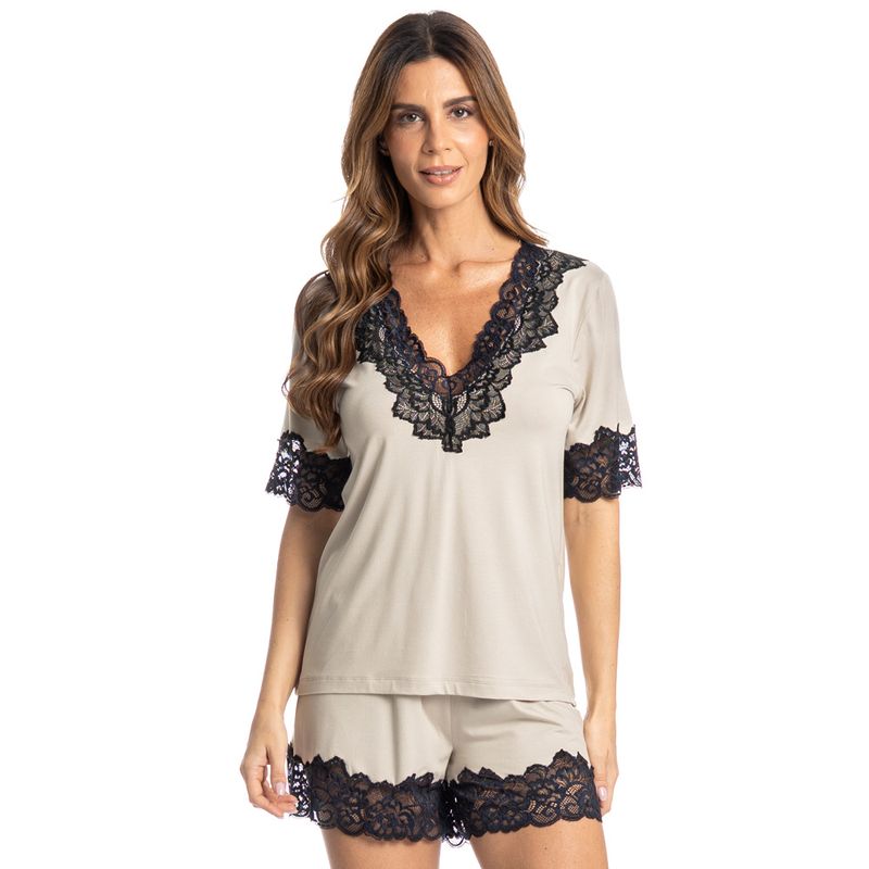 Pijama Feminino Curto Com Renda Maia é puro conforto! Sua blusa possui modelagem ampla em manga curta, conta com aplicação de uma sofisticada renda em seu decote e mangas. Seu short de comprimento curto, possui elástico macio no cós e renda na barra. Detalhe para sua etiqueta personalizada aplicada no centro do cós. Delicadeza das rendas, modelagem moderna com tecido de toque surpreendente e a sofisticação que você merece!