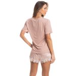 Pijama Feminino Curto Gaia é conforto para suas noites! Sua blusa em modelagem ampla, possui mangas curtas e decote em “V” com aplicação de uma linda e delicada renda. Seu short é amplo e confortável com aplicação de renda na barra, detalhe para sua sofisticada etiqueta de cetim logo Daniela Tombini no centro do cós garantindo muito charme e elegância a peça!