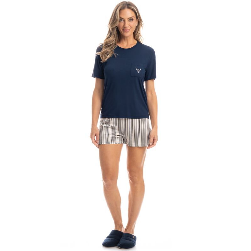 Pijama Feminino Curto Maitê é puro conforto! Em modelagem ampla, com um tecido de toque surpreendente, o pijama Maitê é perfeito para suas noites. Sua blusa manga curta possui decote redondo com acabamentos em viés e bolso com um delicado bordado, garantindo ainda mais charme. Seu shorts é listrado e possui elástico macio no cós para melhor descanso! Muito conforto e estilo para seus momentos de descanso!