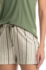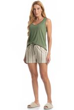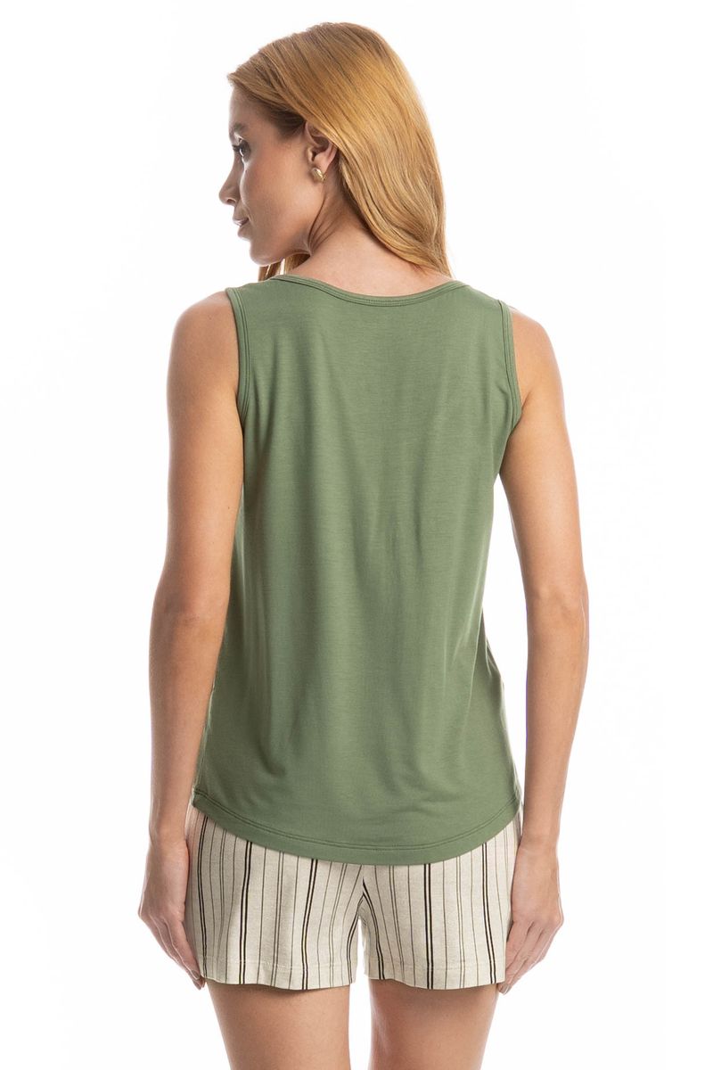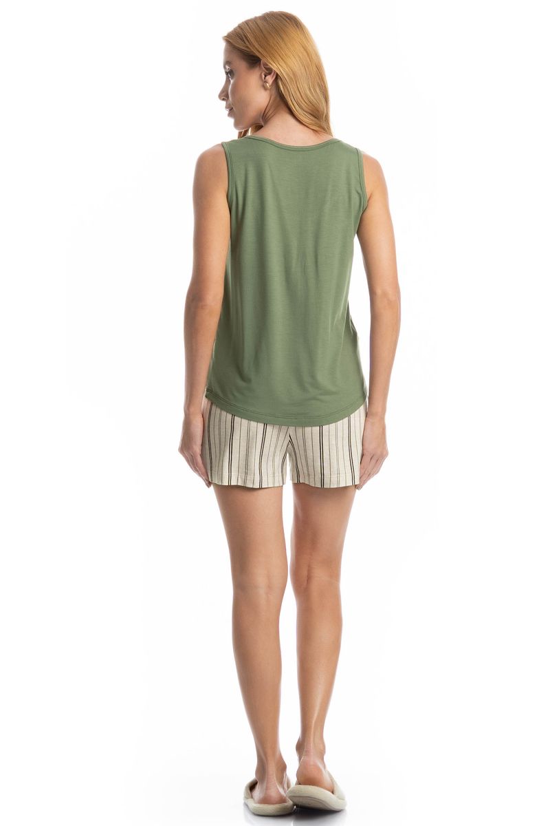 Pijama Feminino Curto Regata Leila é perfeito para os dias mais quentes! Sua blusa em modelagem regata conta com decote redondo com acabamento em viés. Detalhe para seu bordado Daniela Tombini na lateral esquerda da peça. Seu shorts é soltinho e estampado em um lindo e exclusivo listrado, detalhe para seu amarre decorativo no centro do cós.