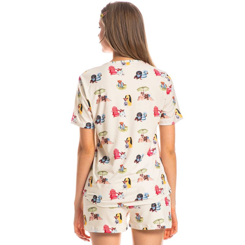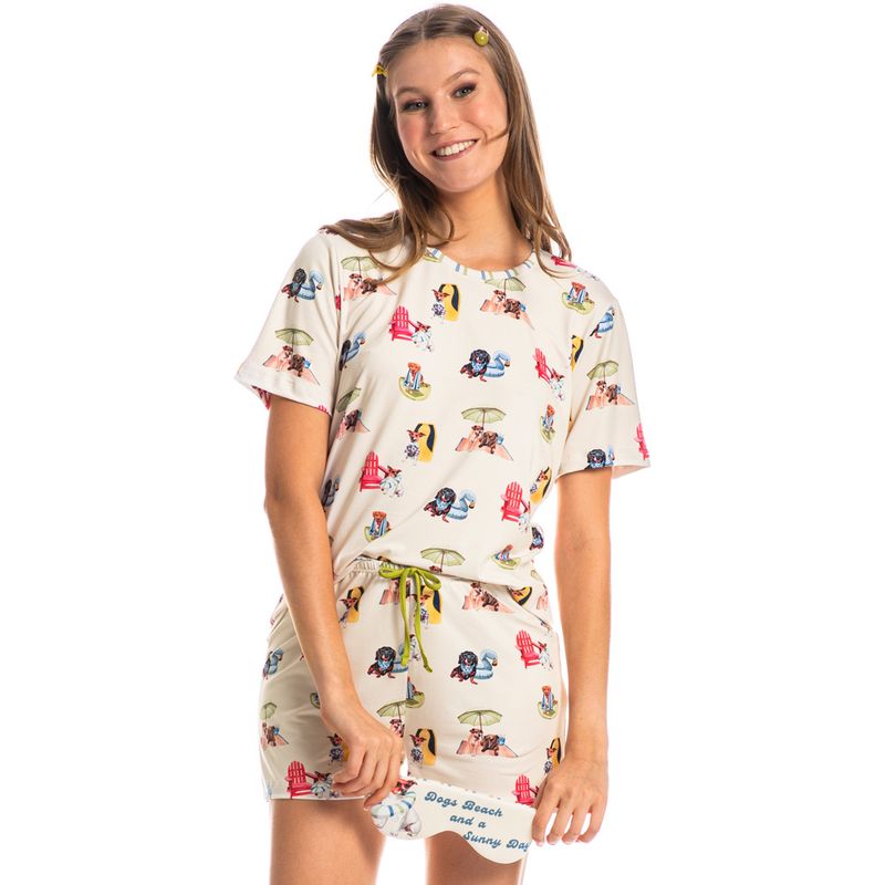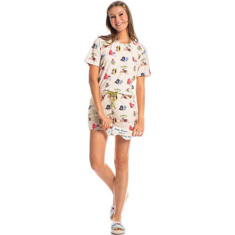 Pijama Feminino Curto Vira Latas é estilo para suas noites! Sua blusa em modelagem ampla e confortável possui decote redondo com acabamento em viés. Seu short possui modelagem leve, e conta com elástico macio no cós, para melhor conforto em suas horas de descanso. Detalhe para seu amarre no centro do cós. A peça é toda estampada com fofos cachorrinhos na praia, impossível não se apaixonar!