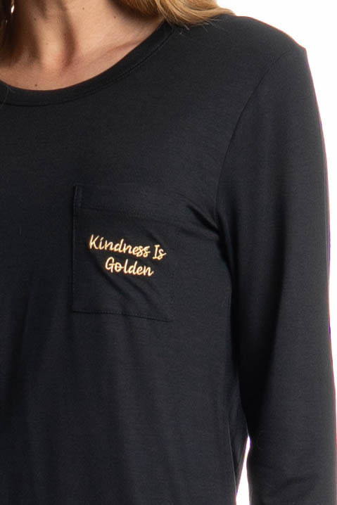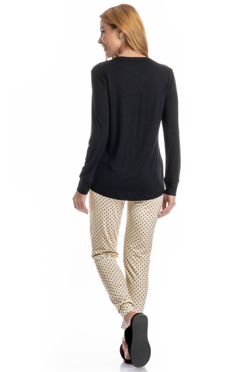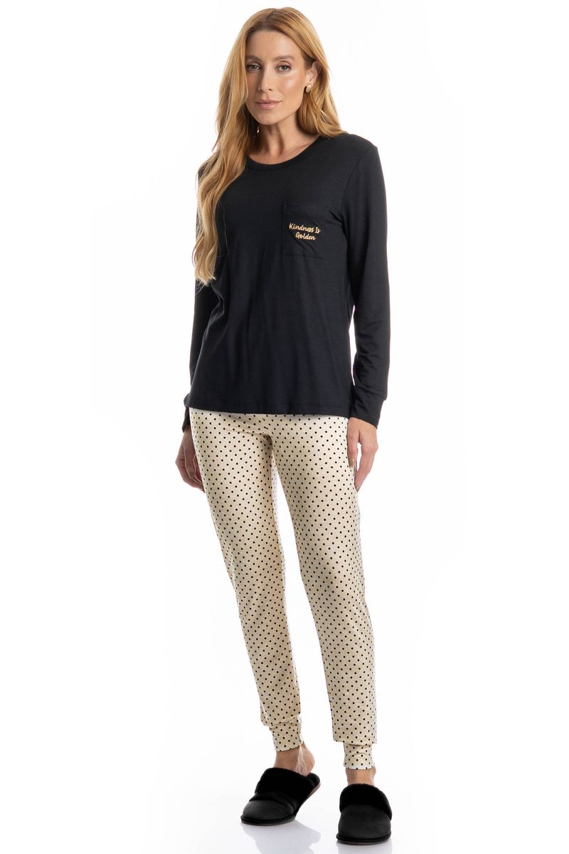 Pijama Feminino Legging Sabrina é confortável e sofisticado, ideal para quem busca estilo aliado ao bem-estar. Composto por blusa de manga longa e calça longa estilo legging. A blusa possui design minimalista e possui bolso na lateral esquerda com o bordado Kindness Is Golden. Detalhe para sua calça com uma linda estampa de poá. Versátil, é perfeito para momentos de descanso cheio de conforto e elegância!
