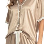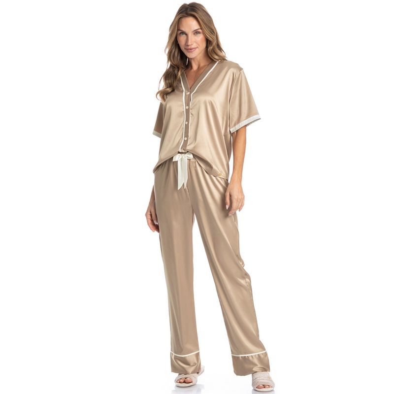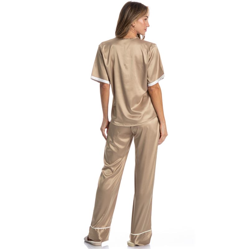 Pijama Feminino Longo Americano Em Cetim Siena é pura elegância! Sua blusa possui decote em V, manga curta e frente abotoada com um excelente acabamento com sofisticados filetes de cetim em tom contrastante e botões bem fixados. Detalhe para seu acabamento nas mangas com viés, garantindo muito charme. Já a sua calça, conta com elástico macio proporcionando um melhor descanso, e um lindo laço aplicado no centro do cós. Detalhe para sua barra com filetes de cetim contrastante que conferem muita delicadeza a peça. Este pijama é uma excelente opção para quem busca sofisticação e elegância para todas as horas do dia!
