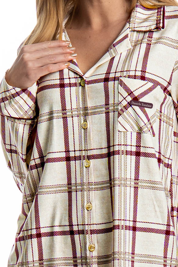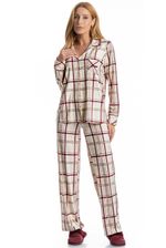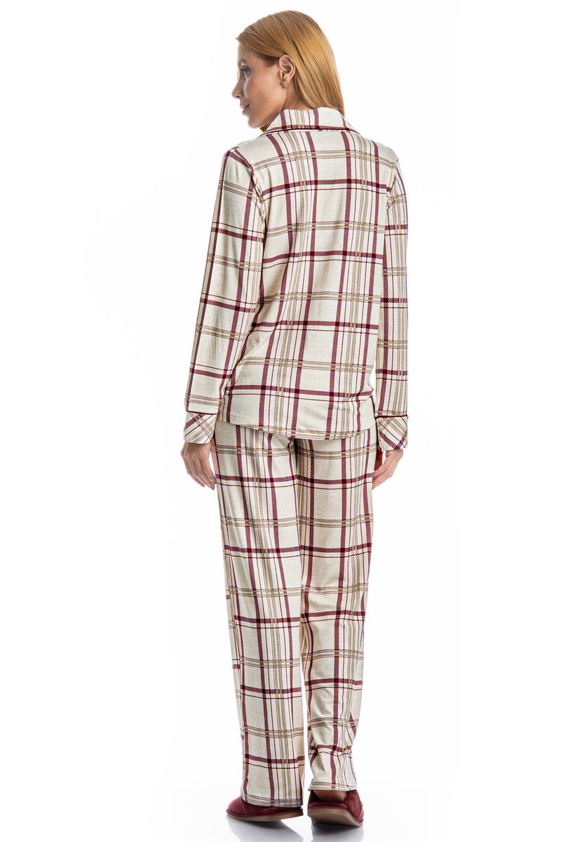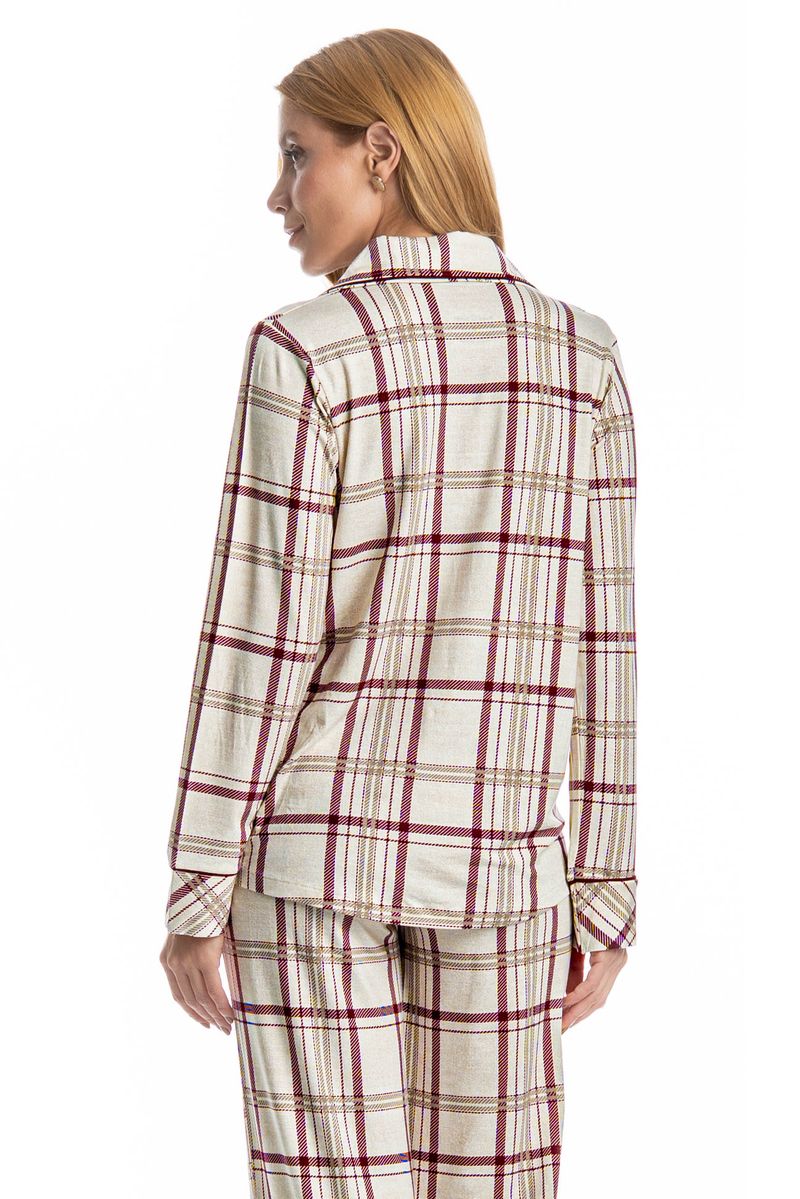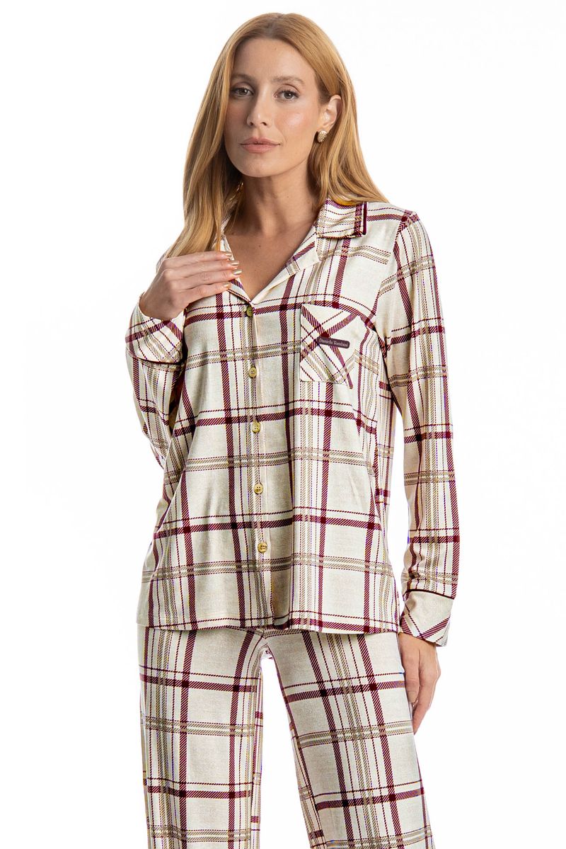 Pijama Feminino Longo Americano Jaque é estilo para suas horas de descanso! Sua blusa com gola e manga longa possui modelagem ampla e confortável, é abotoada e conta com um perfeito acabamento e botões bem fixados, detalhe para seu bolso na lateral esquerda. Sua calça possui elástico macio no cós para um melhor descanso. Detalhe para sua clássica estampa xadrez, perfeito para estar com você nos melhores momentos do seu dia!