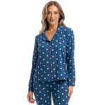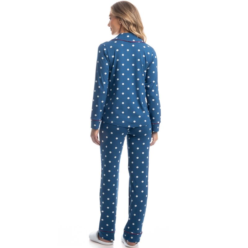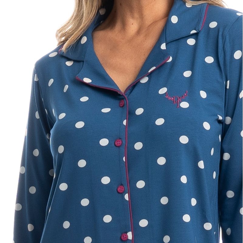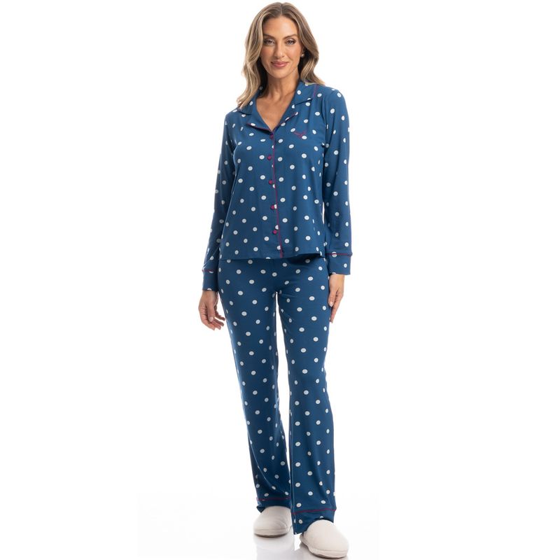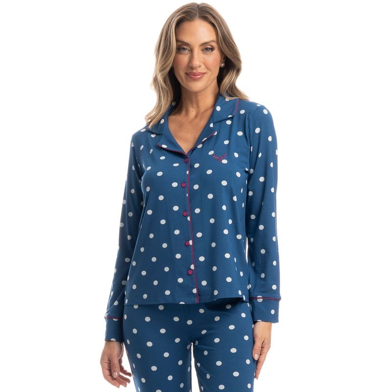 Pijama Feminino Longo Americano Mel é a elegância que você procurava! Sua blusa abotoada conta com vivo contrastante aplicado em todo o transpasse, seu decote em gola e suas mangas longas com punhos também possuem vivo como detalhe, além do Trigo Daniela Tombini bordado na lateral esquerda da camisa. Sua calça em modelagem confortável, possui punho com vivo aplicado e elástico macio no cós, para melhor conforto em suas horas de descanso. A escolha perfeita para você aproveitar a melhor estação do ano!