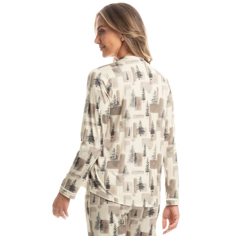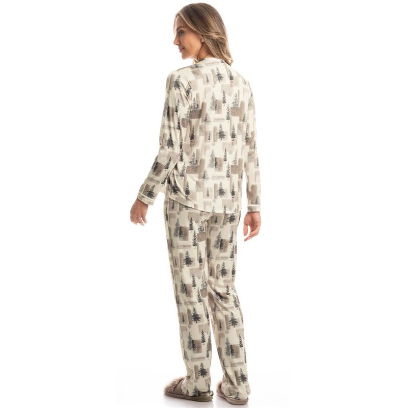 Pijama Feminino Longo Americano Pinheiros é conforto para suas noites! Sua blusa possui decote em V, manga longa e frente abotoada com perfeito acabamento e botões bem fixados. Já a sua calça, possui elástico macio e confortável para um melhor descanso. A peça é toda estampada com pinheiros, muito conforto e exclusividade para as horas de descanso!