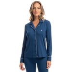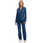Pijama Feminino Longo Americano Samantha é pura elegância! Sua blusa possui decote em V com gola, manga longa e frente abotoada com um excelente acabamento, detalhe para seu delicado bordado logo Daniela Tombini, e seus acabamentos em vivo de tom contrastante nas mangas, abertura da frente e gola, proporcionando ainda mais sofisticação. Já sua calça, possui uma modelagem soltinha e leve. Muito conforto para você curtir a melhor estação do ano!