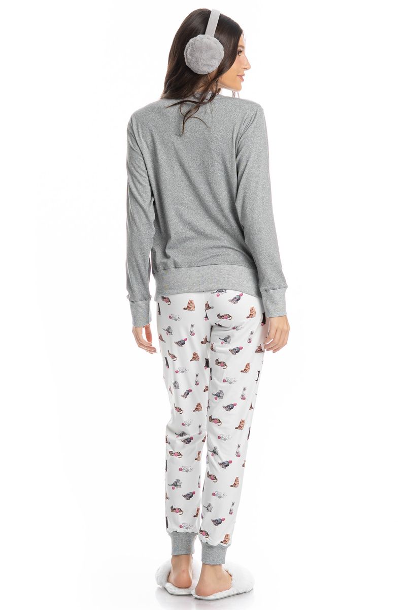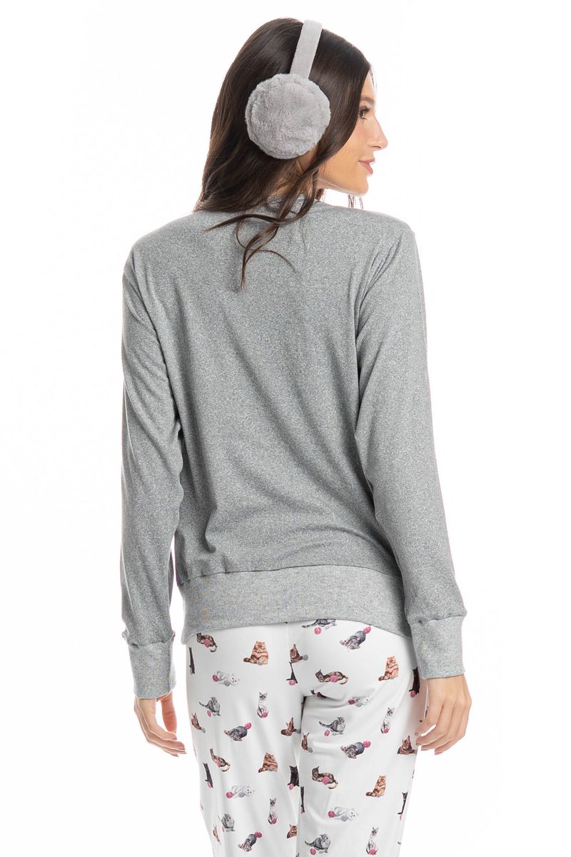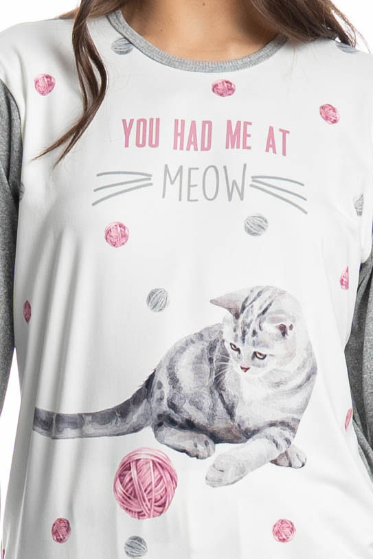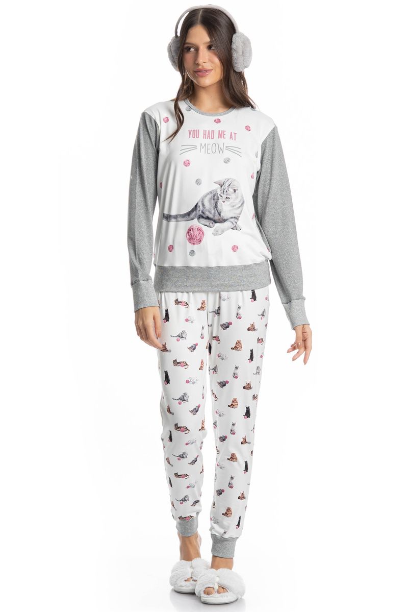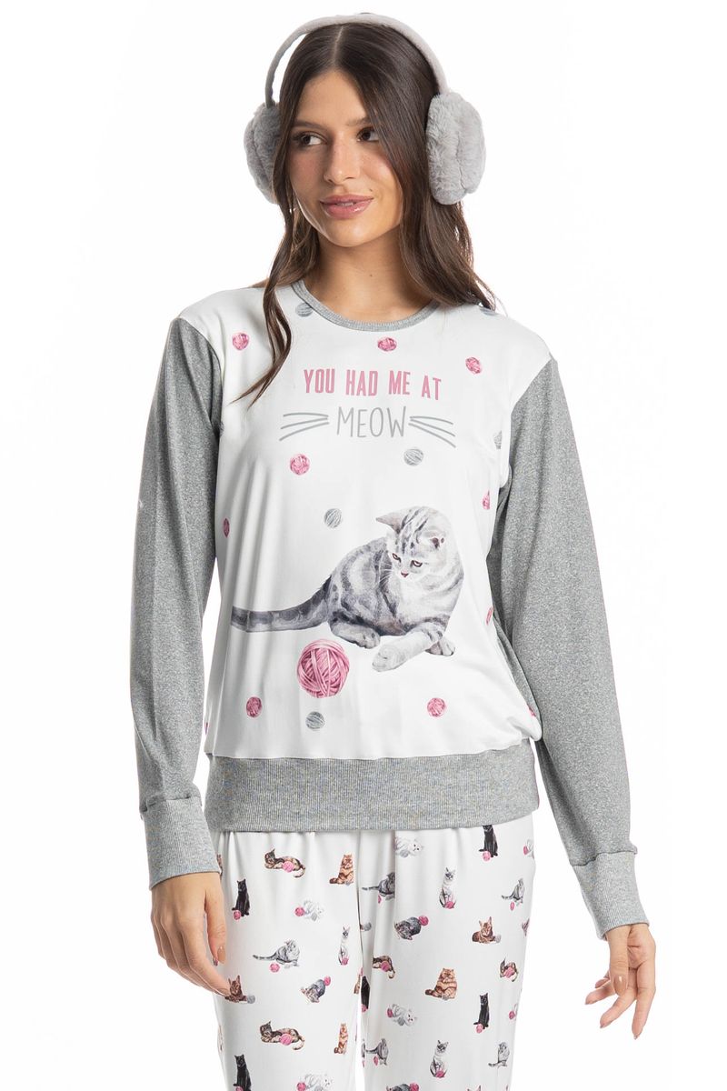 Pijama Feminino Longo Cats é puro charme! Em modelagem ampla e confortável, seu decote é redondo e suas mangas são longas com acabamentos em punhos. Sua calça com modelagem confortável, possui acabamento na barra em punho, e elástico macio no cós para um melhor descanso. Detalhe para suas exclusivas e divertidas estampas de gatinhos, e com a escrita localizada ao centro da blusa “You Had Me At Meow”, impossível não se apaixonar!