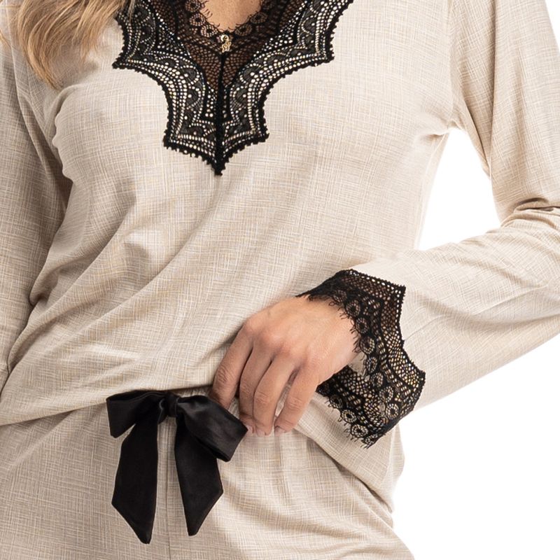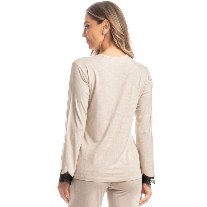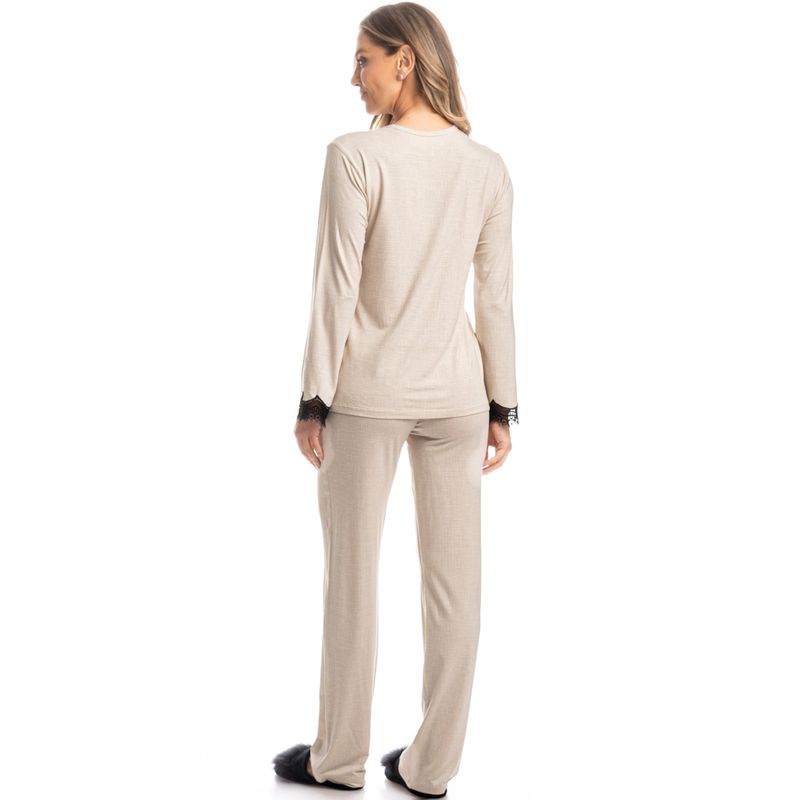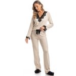 Pijama Feminino Longo Com Renda Bruna é perfeito para as noites mais quentes! Sua blusa manga longa em modelagem ampla, possui acabamento em uma linda renda no decote e barra das mangas, detalhe para seu delicado pingente no centro do decote. Sua calça possui modelagem mais solta com elástico macio e confortável, e um sofisticado laço de cetim cós. Muito conforto e estilo para seus momentos de descanso!